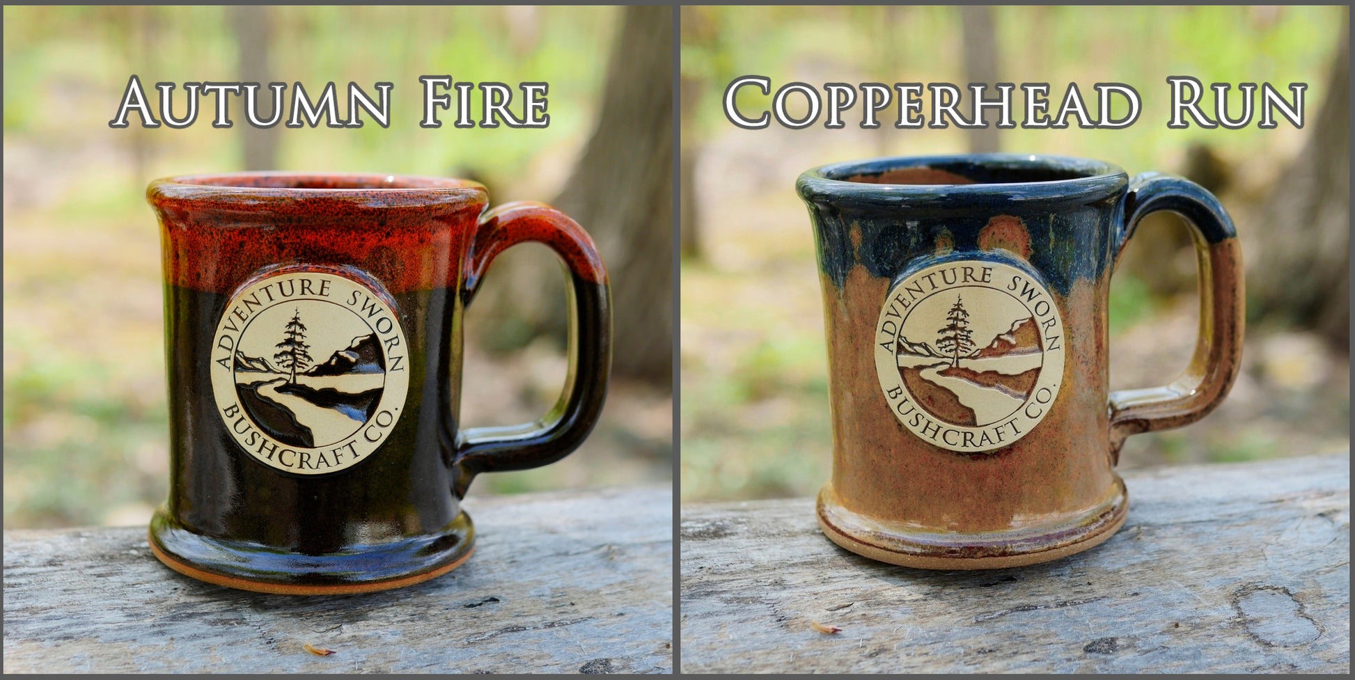 These mugs are handcrafted in the USA; wheel spun stoneware branded with our landscape Adventure Sworn Bushcraft Co. logo.