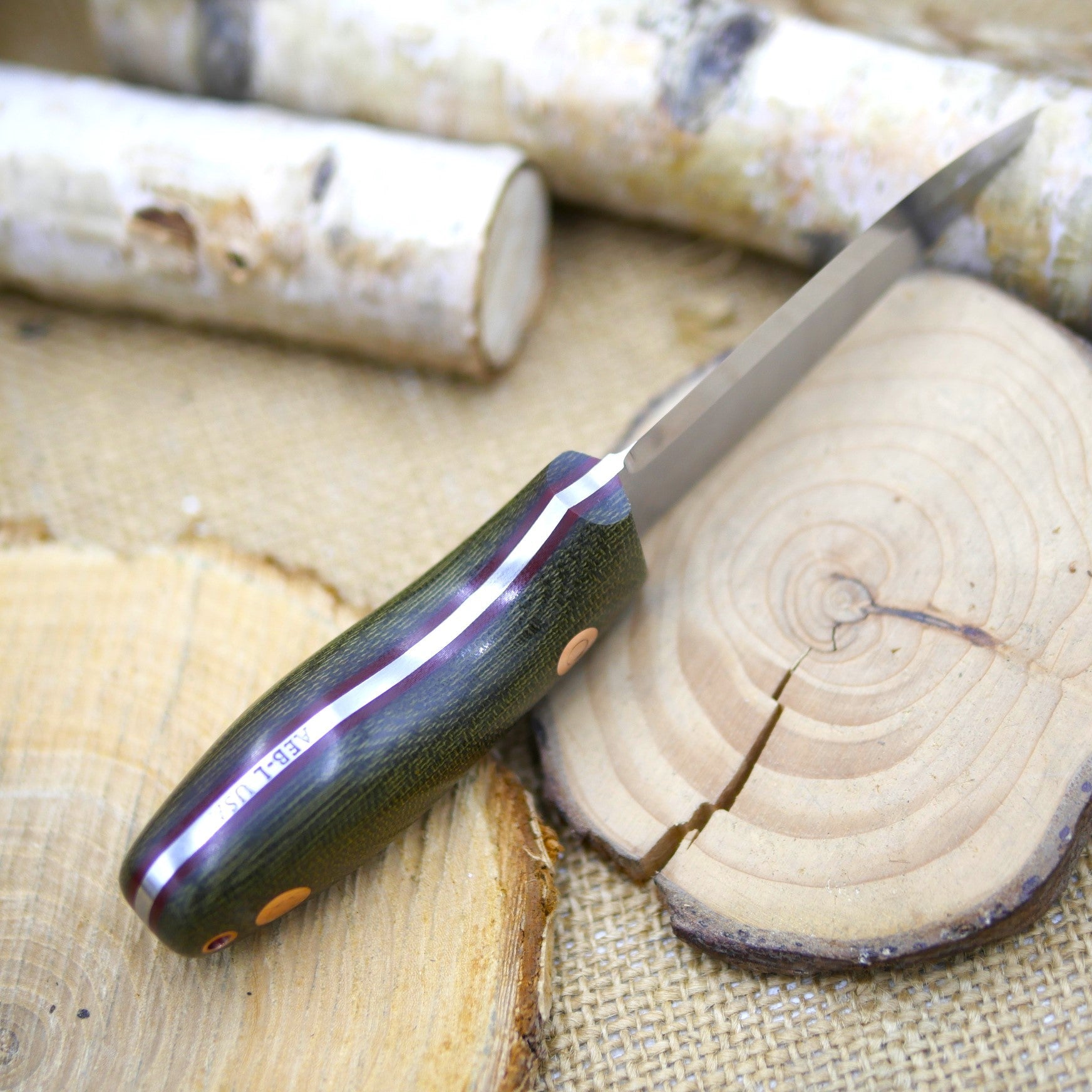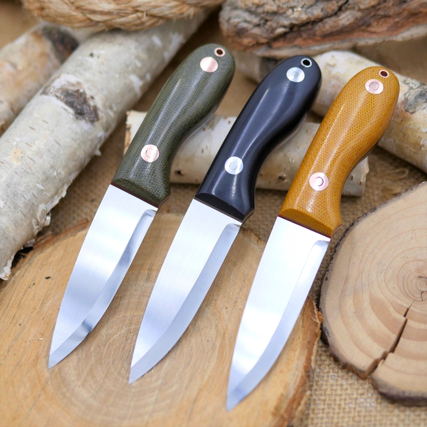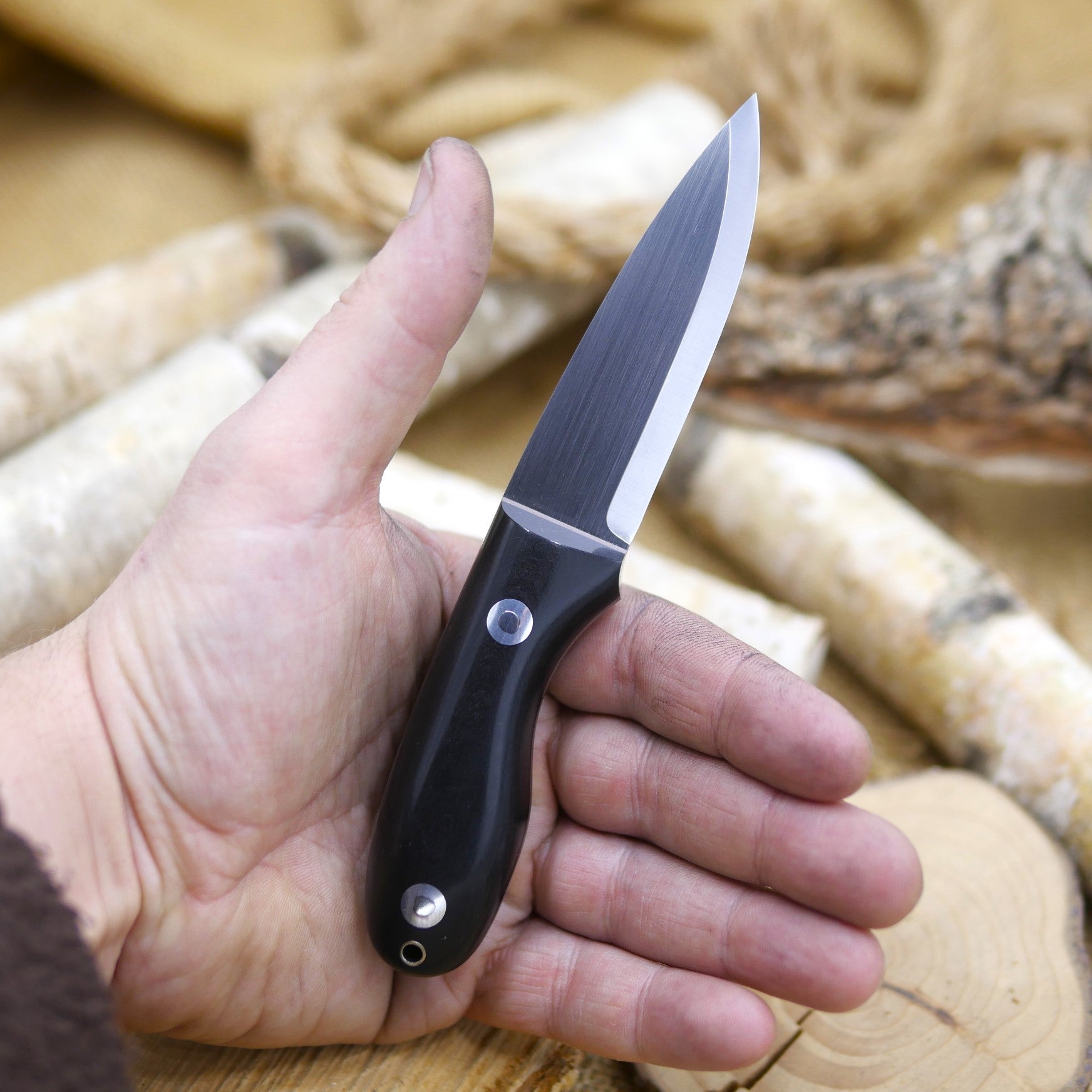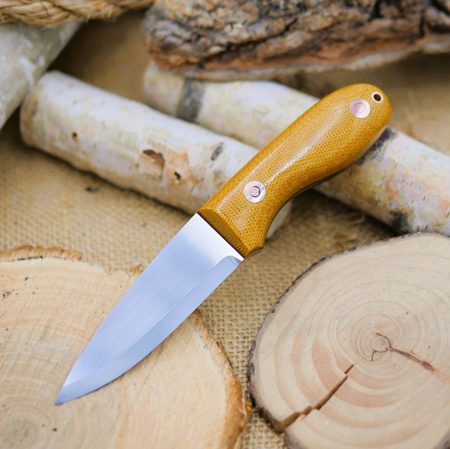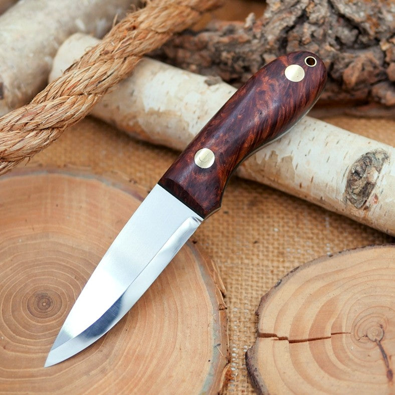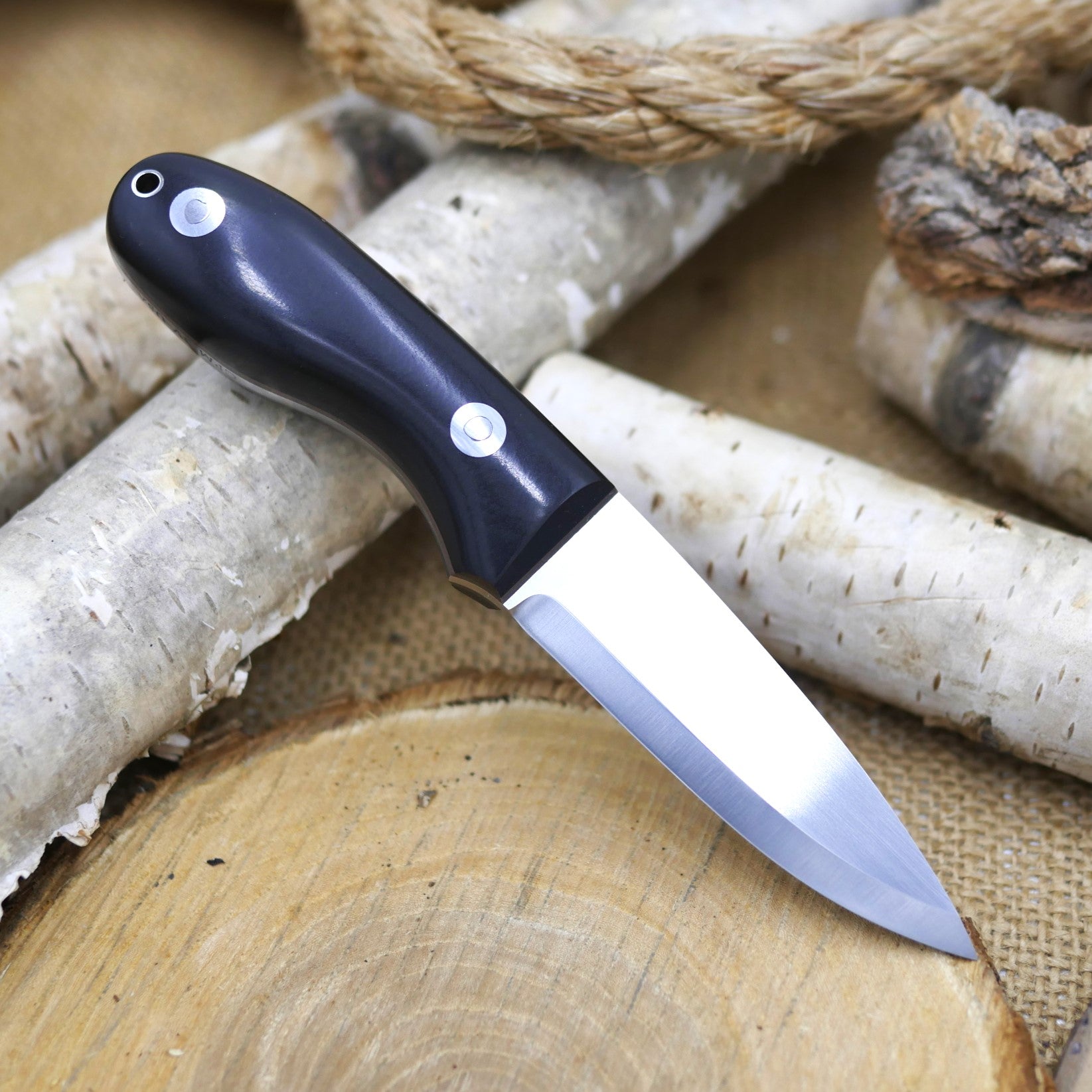The Walker is a compact bushcraft knife. Its blade has a 3" cutting edge and a drop-spearpoint shape, allowing for excellent control and detail in woodcarving tasks. The stout blade can handle batonning of logs up to wrist-thickness. Designed to be comfortable in any grip, the Walker's short handle and teardrop contour fills the hand very well, allowing switching grips to feel effortless. The Walker may serve as the lightweight bushcrafter's sole cutting tool, or pairs perfectly with an axe or larger knife.