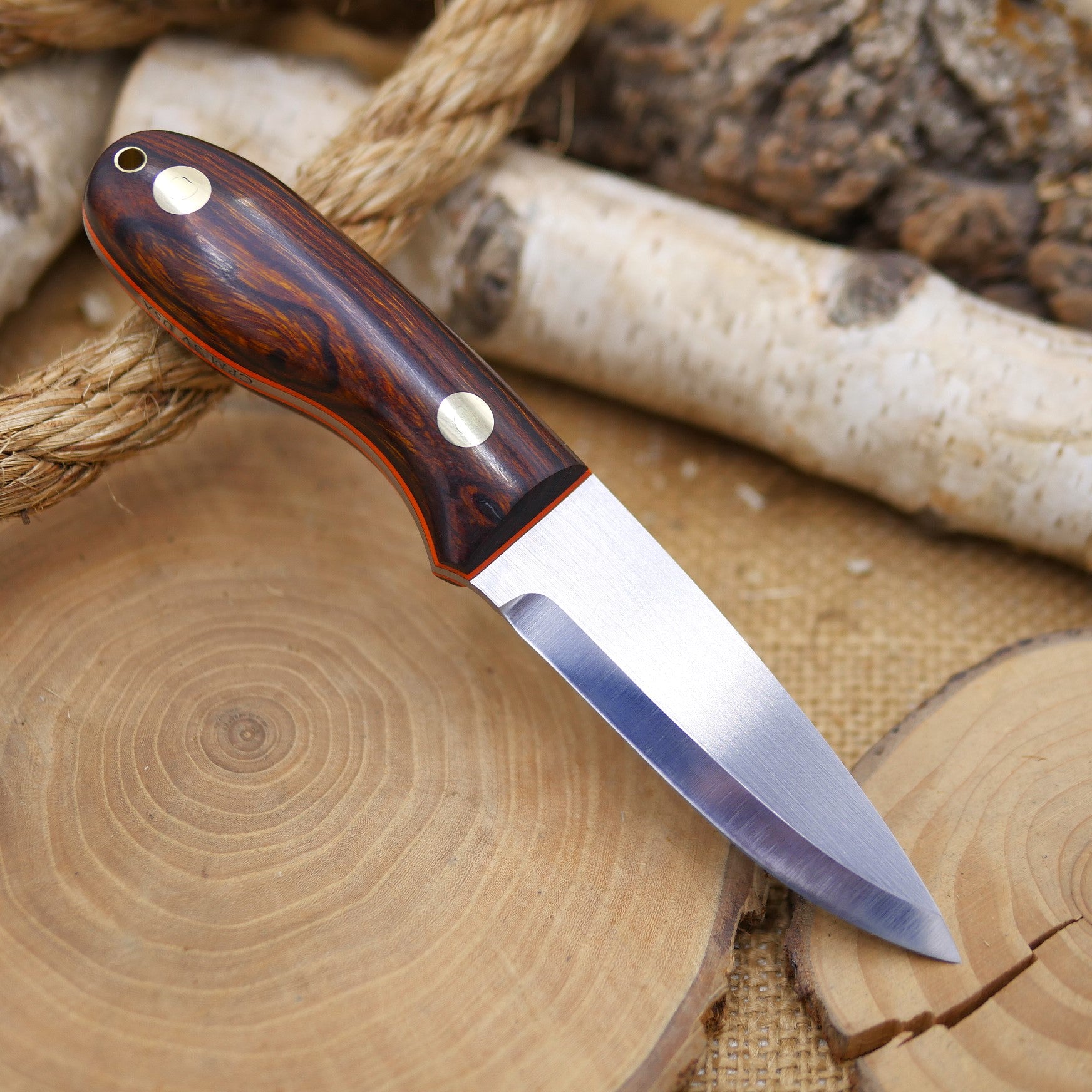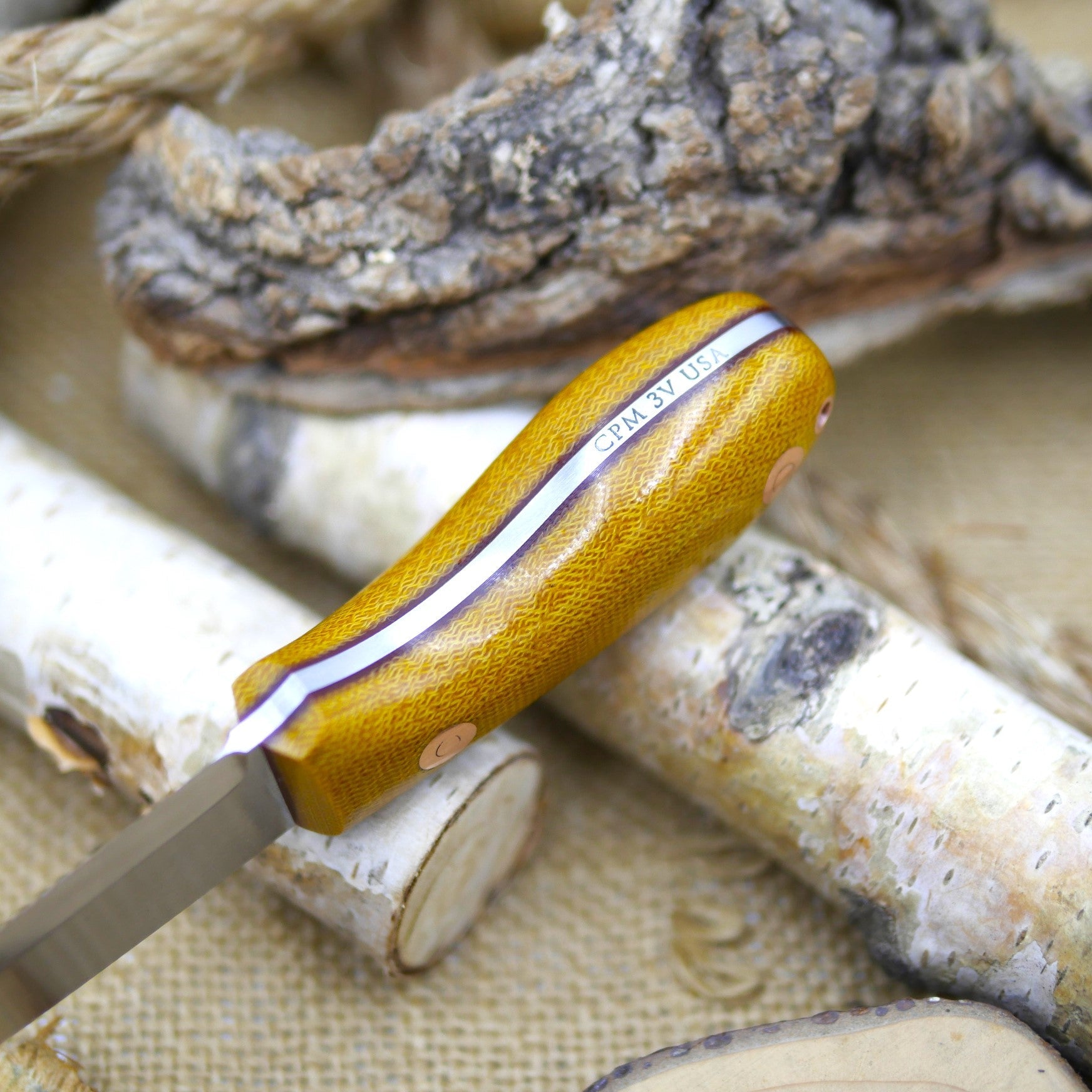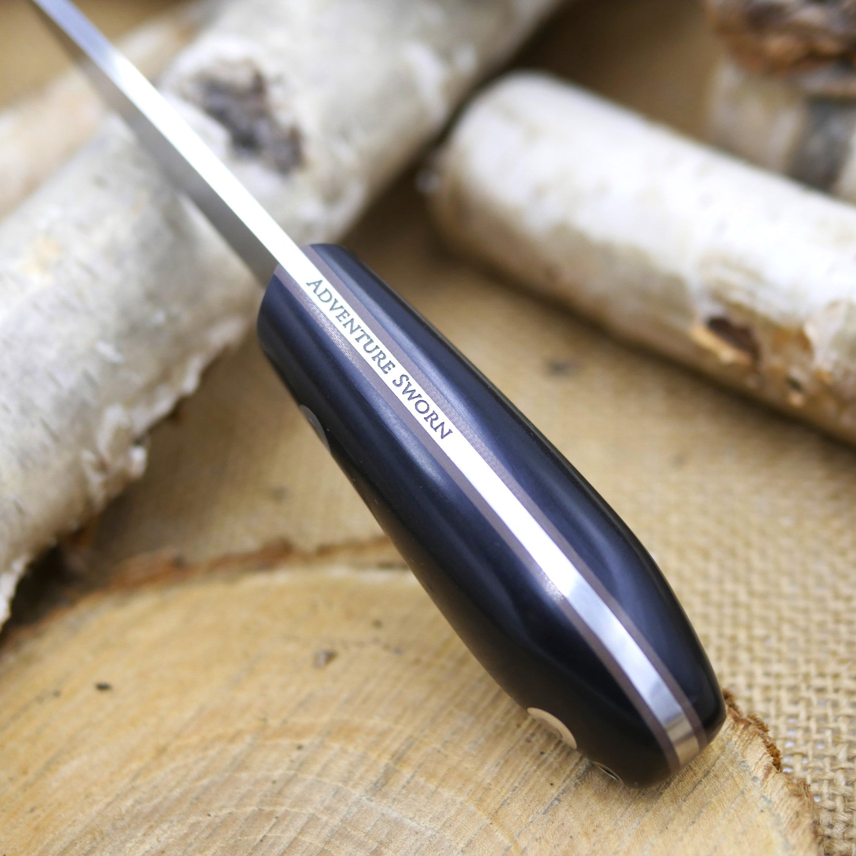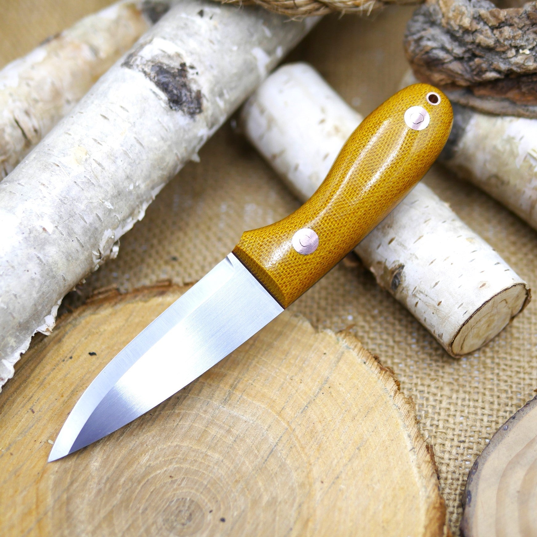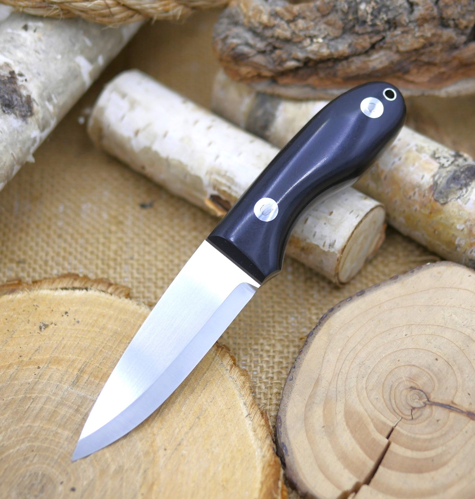 The Walker is a compact bushcraft knife. Its blade has a 3" cutting edge and a drop-spearpoint shape, allowing for excellent control and detail in woodcarving tasks. The stout blade can handle batonning of logs up to wrist-thickness. Designed to be comfortable in any grip, the Walker's short handle and teardrop contour fills the hand very well, allowing switching grips to feel effortless. The Walker may serve as the lightweight bushcrafter's sole cutting tool, or pairs perfectly with an axe or larger knife.