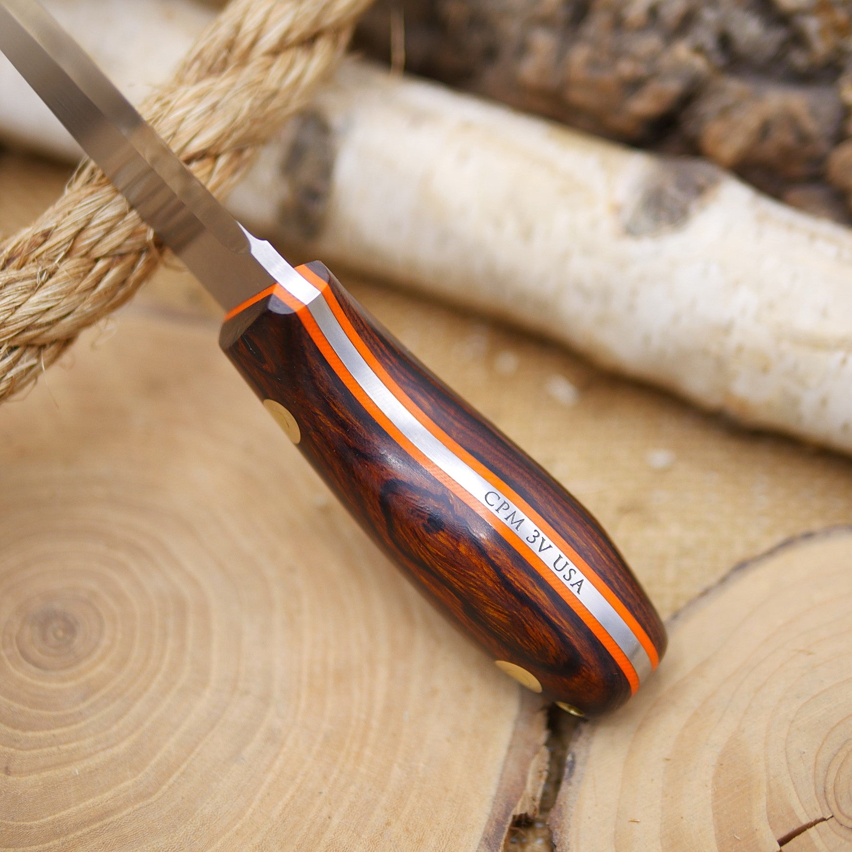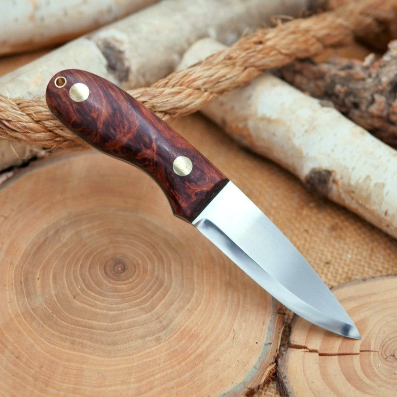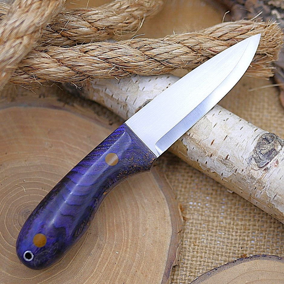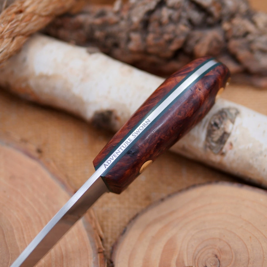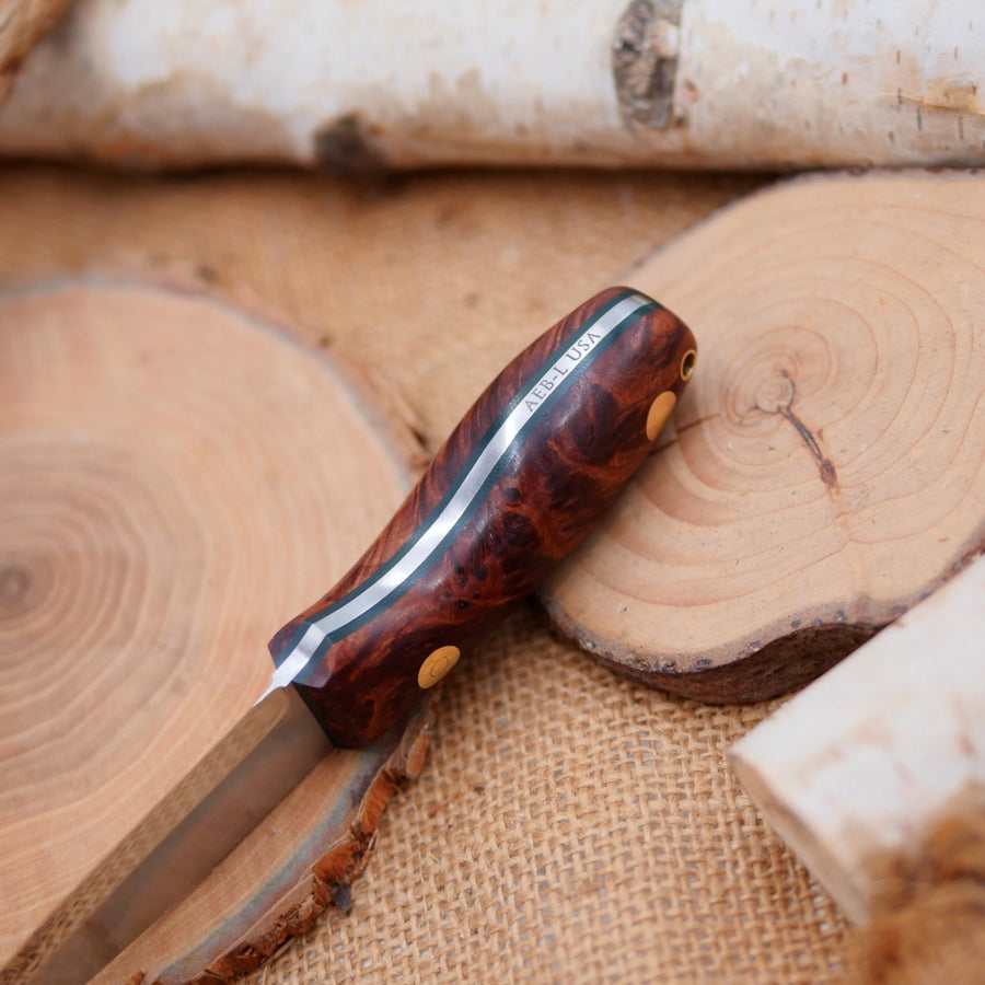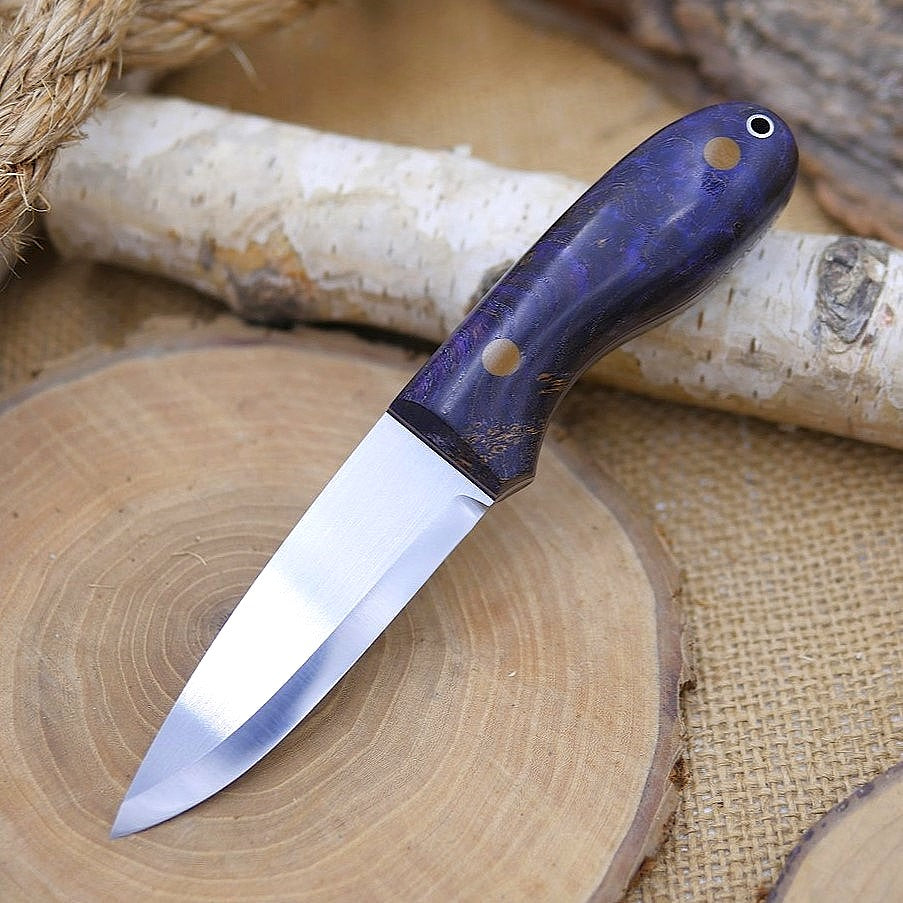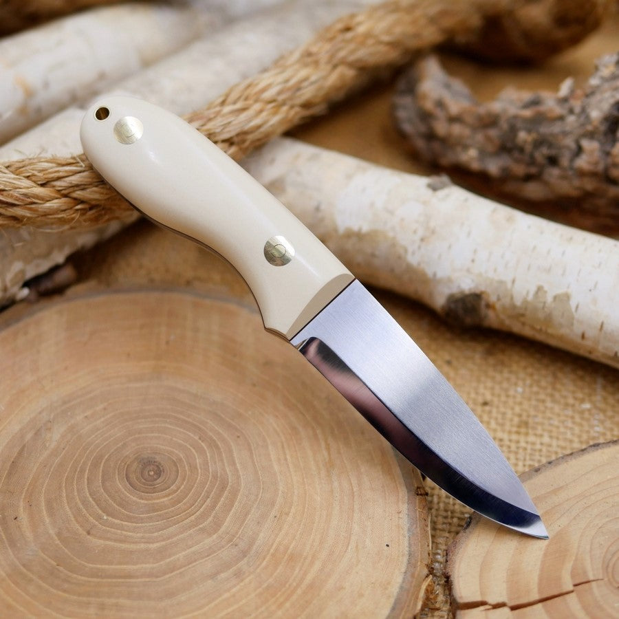 The Walker is a compact bushcraft knife. Its blade has a 3" cutting edge and a drop-spearpoint shape, allowing for excellent control and detail in woodcarving tasks. The stout blade can handle batonning of logs up to wrist-thickness. Designed to be comfortable in any grip, the Walker's short handle and teardrop contour fills the hand very well, allowing switching grips to feel effortless. The Walker may serve as the lightweight bushcrafter's sole cutting tool, or pairs perfectly with an axe or larger knife.
