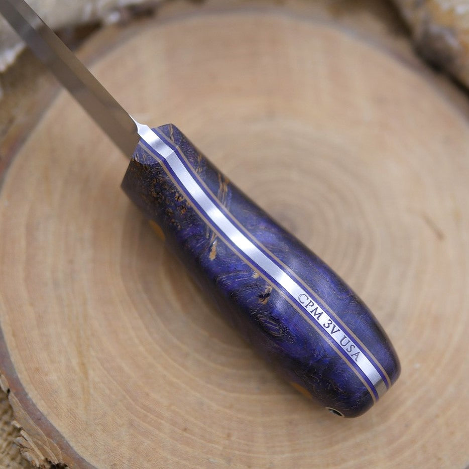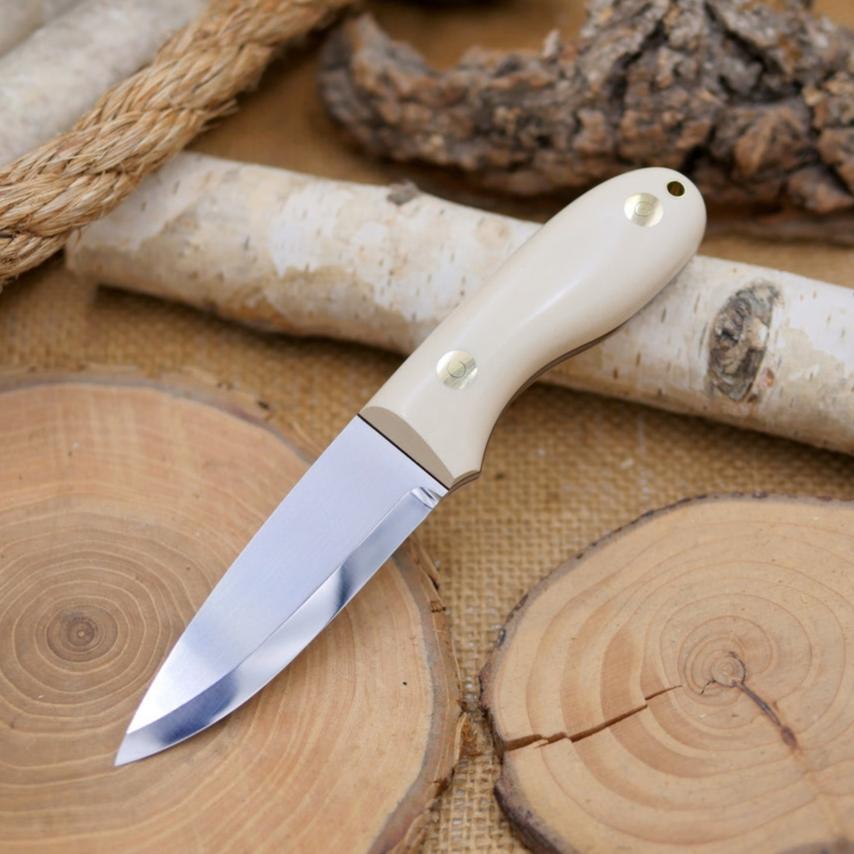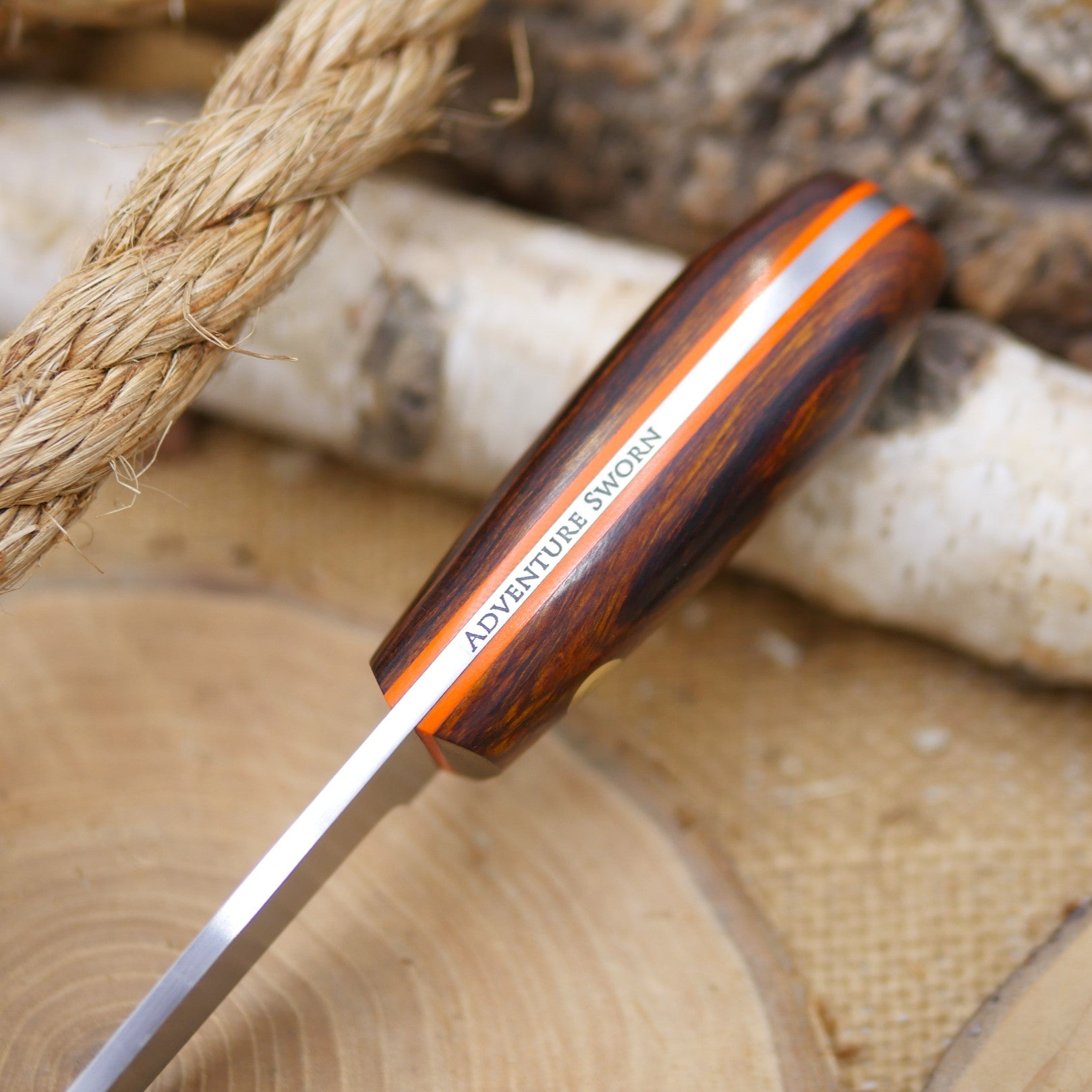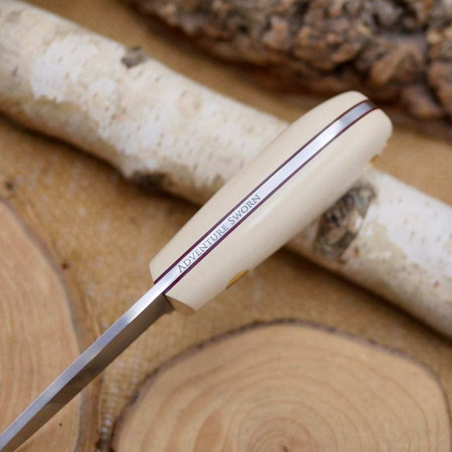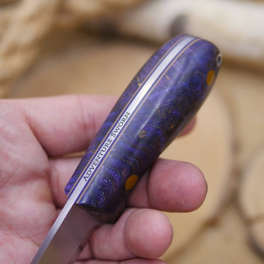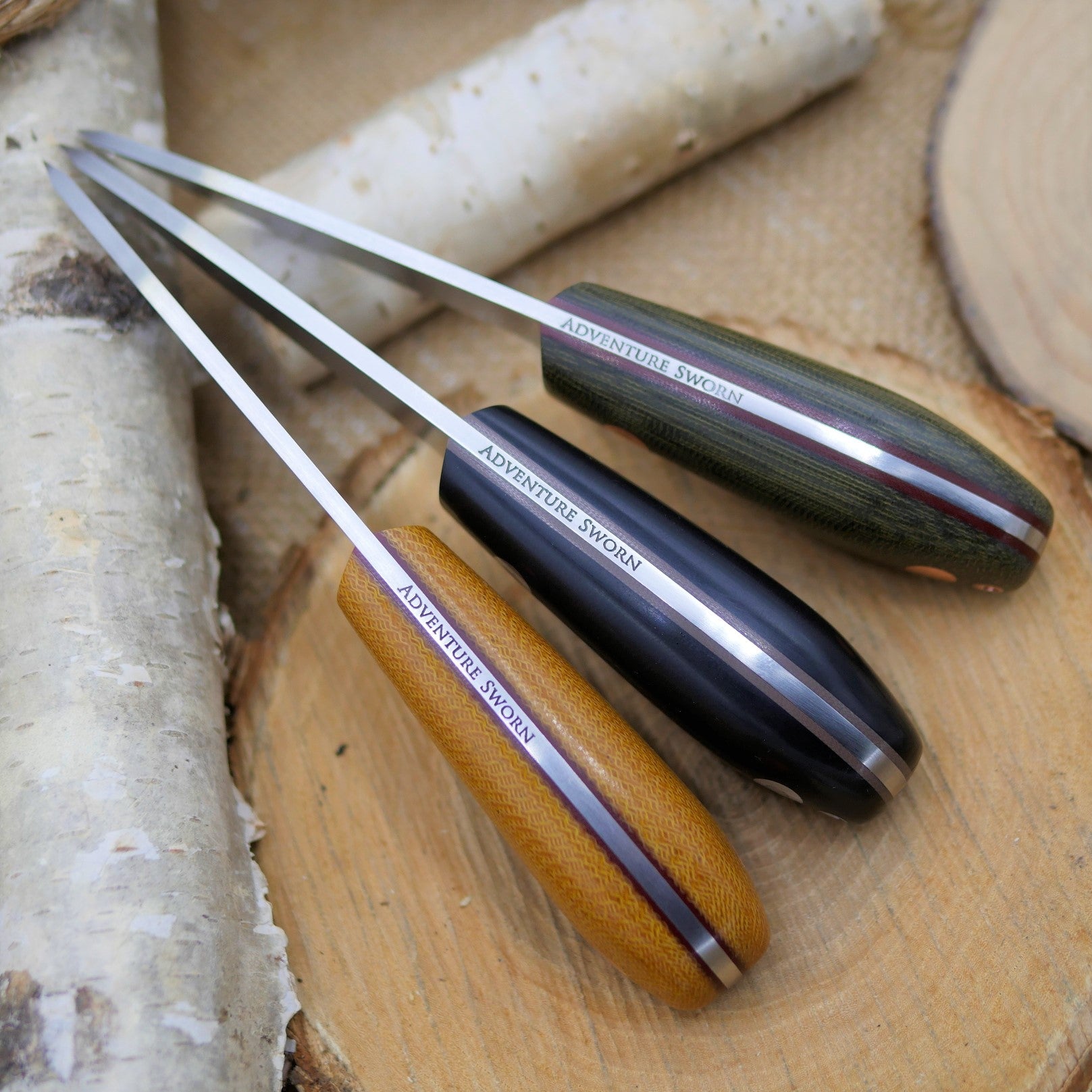 The Walker is a compact bushcraft knife. Its blade has a 3" cutting edge and a drop-spearpoint shape, allowing for excellent control and detail in woodcarving tasks. The stout blade can handle batonning of logs up to wrist-thickness. Designed to be comfortable in any grip, the Walker's short handle and teardrop contour fills the hand very well, allowing switching grips to feel effortless. The Walker may serve as the lightweight bushcrafter's sole cutting tool, or pairs perfectly with an axe or larger knife.