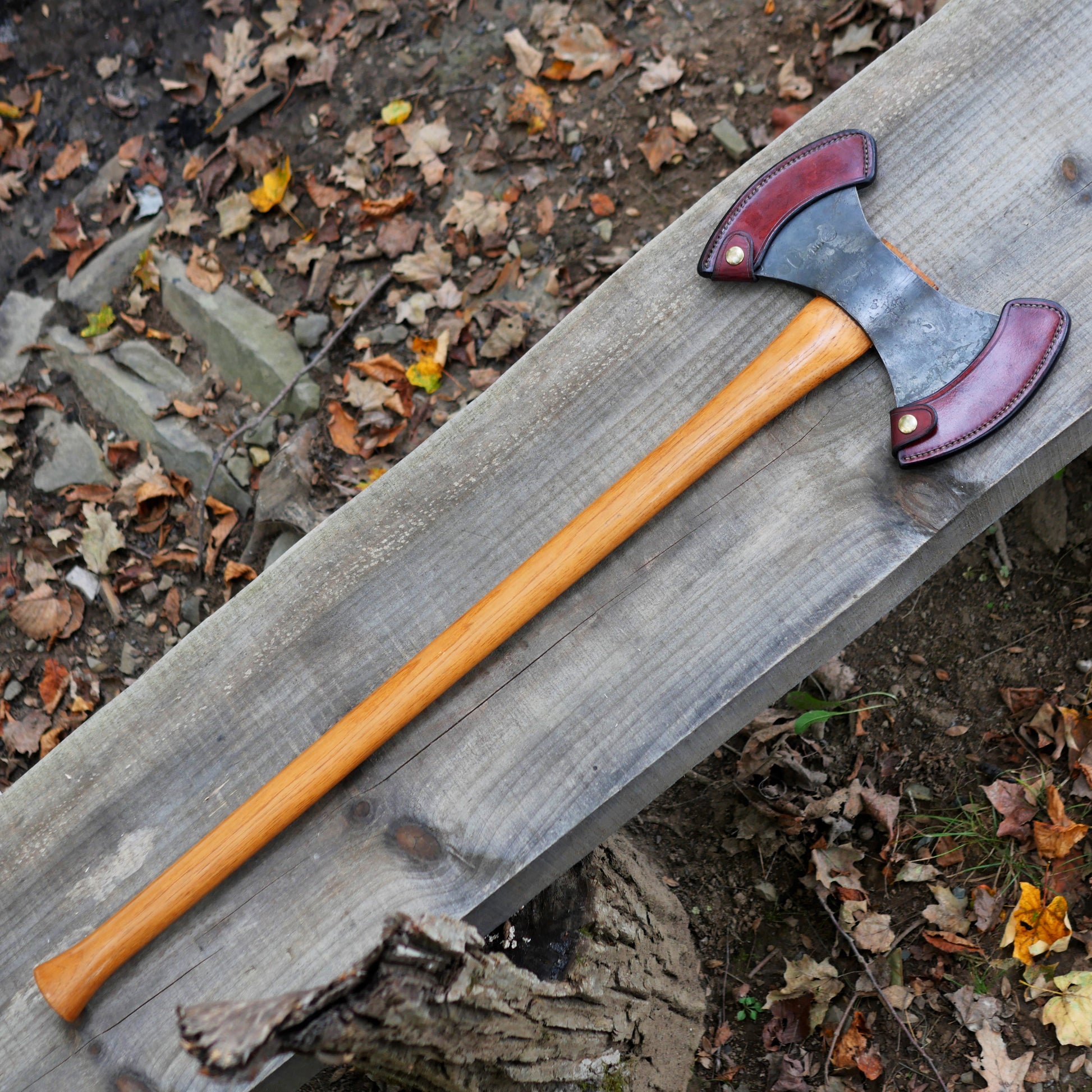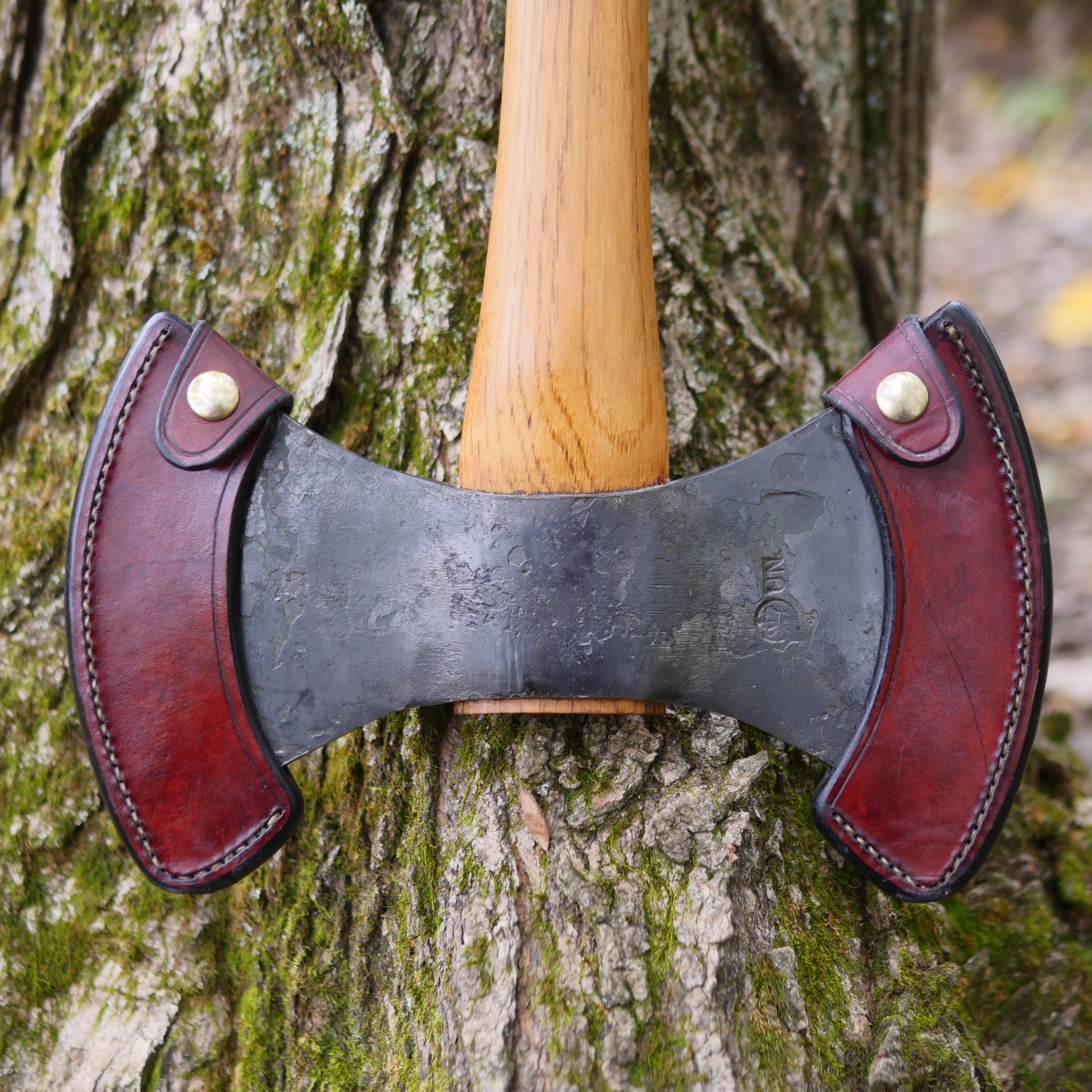 Back in 2012 I made new leather axe masks for the blades, as the blades sheared right through the flimsy ones that came with it. The axe is technically used as I took on maybe three trips, but I mostly wanted this axe as a collector's piece, as it is my favorite axe made by GB. New, this axe (with the factory sheaths) sells for around $395.00, if you manage to find it in stock in the states.
