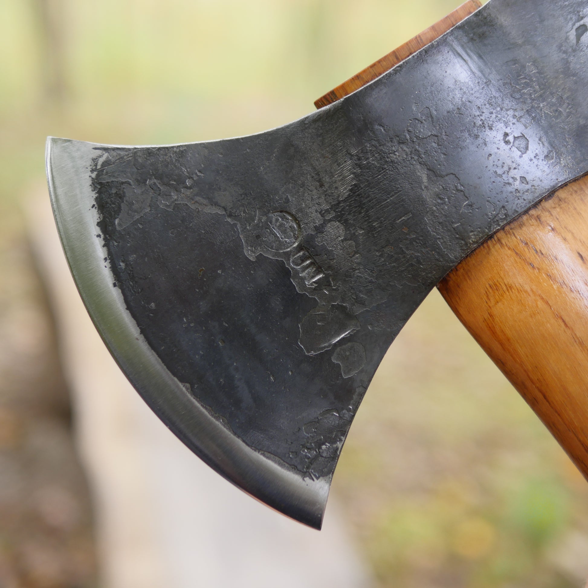 I've polished the edge to make it even sharper than it came. The bit profile is thin and aggressive, and it does a great job slicing through limbs and felling trees. Great vertical grain. Maker is UN.