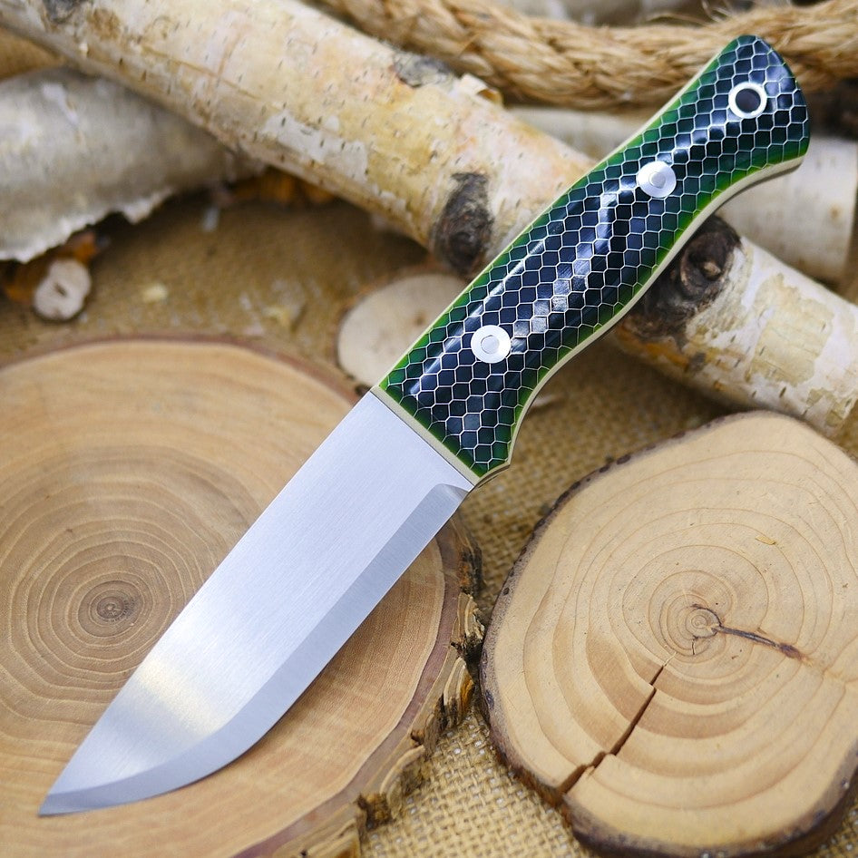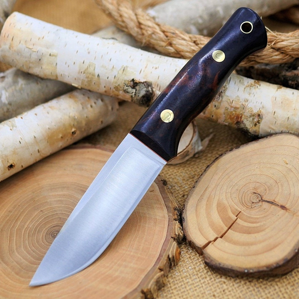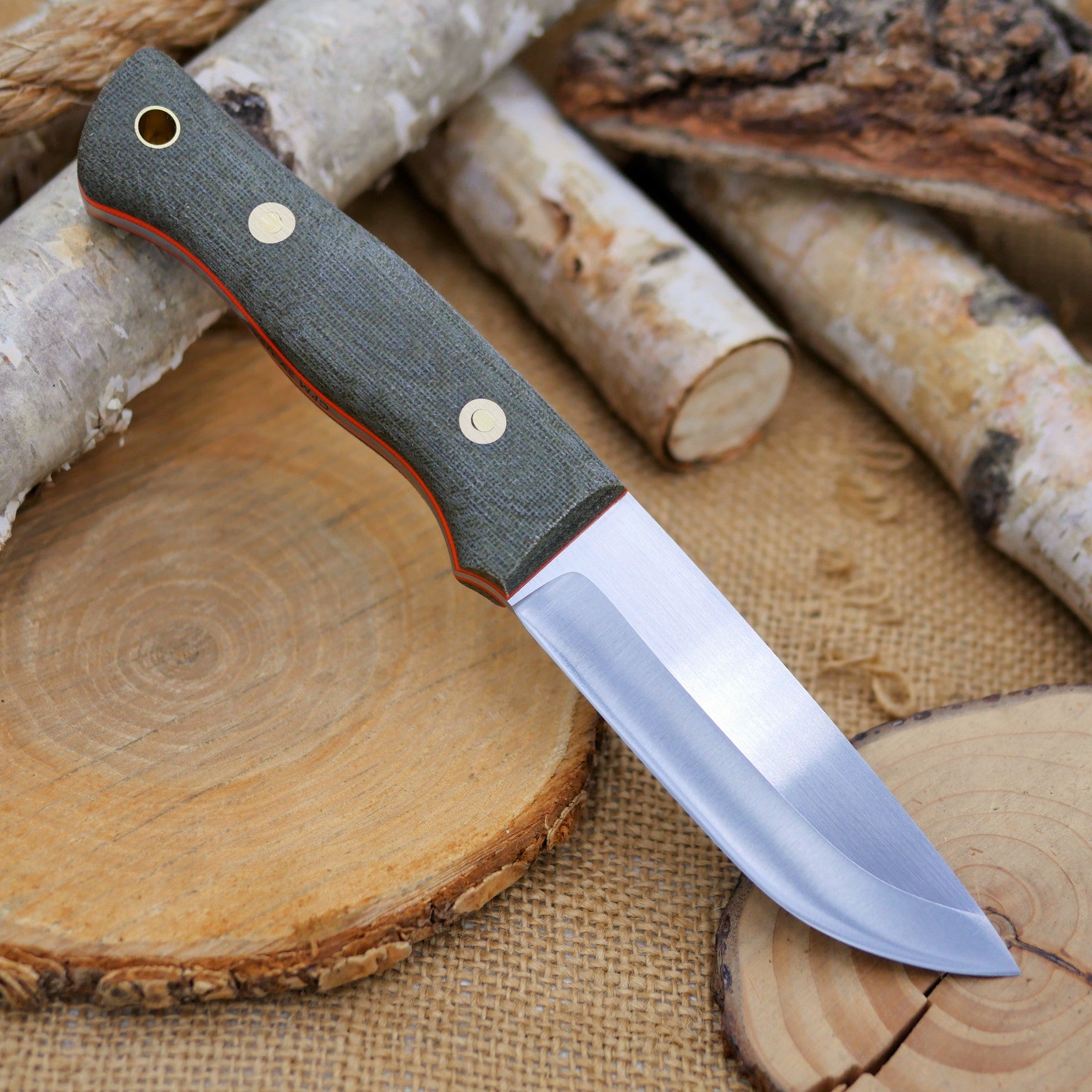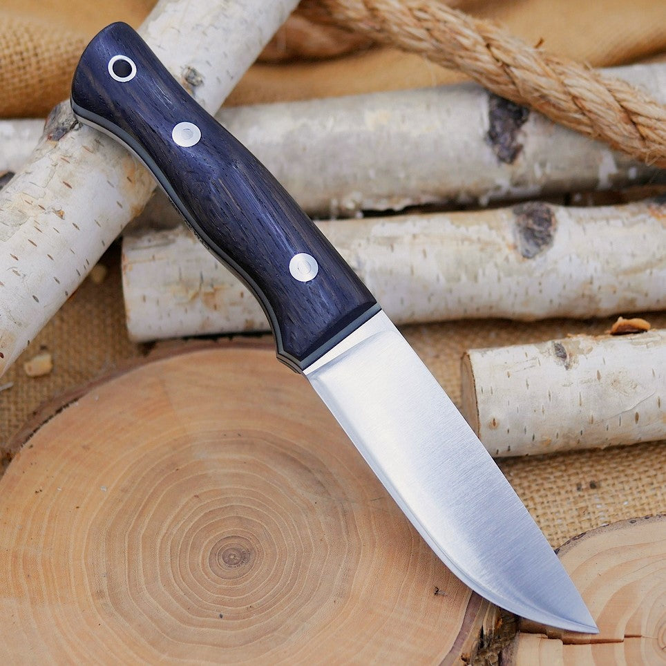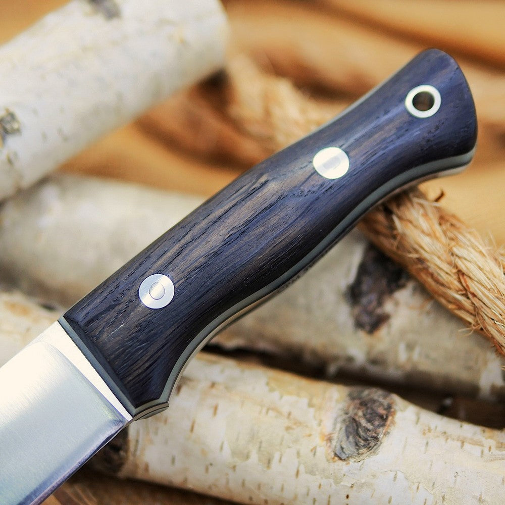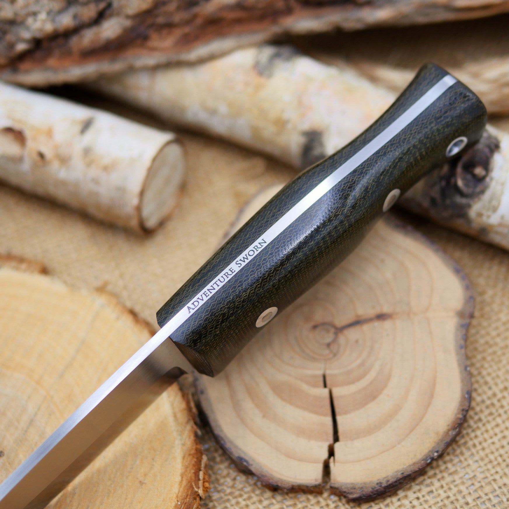 The Huntsman is a bushcraft-hunting knife hybrid which excels at processing wood and game alike.  Its dimensions make it excellent for skinning, gutting, and slicing, as well as making tent stakes, whittling traps, or carving a canoe paddle.  The knife is built strong enough to handle anything from building a shelter to splitting logs for the fire, a true companion to the outdoorsman.  Crafted in the USA.
