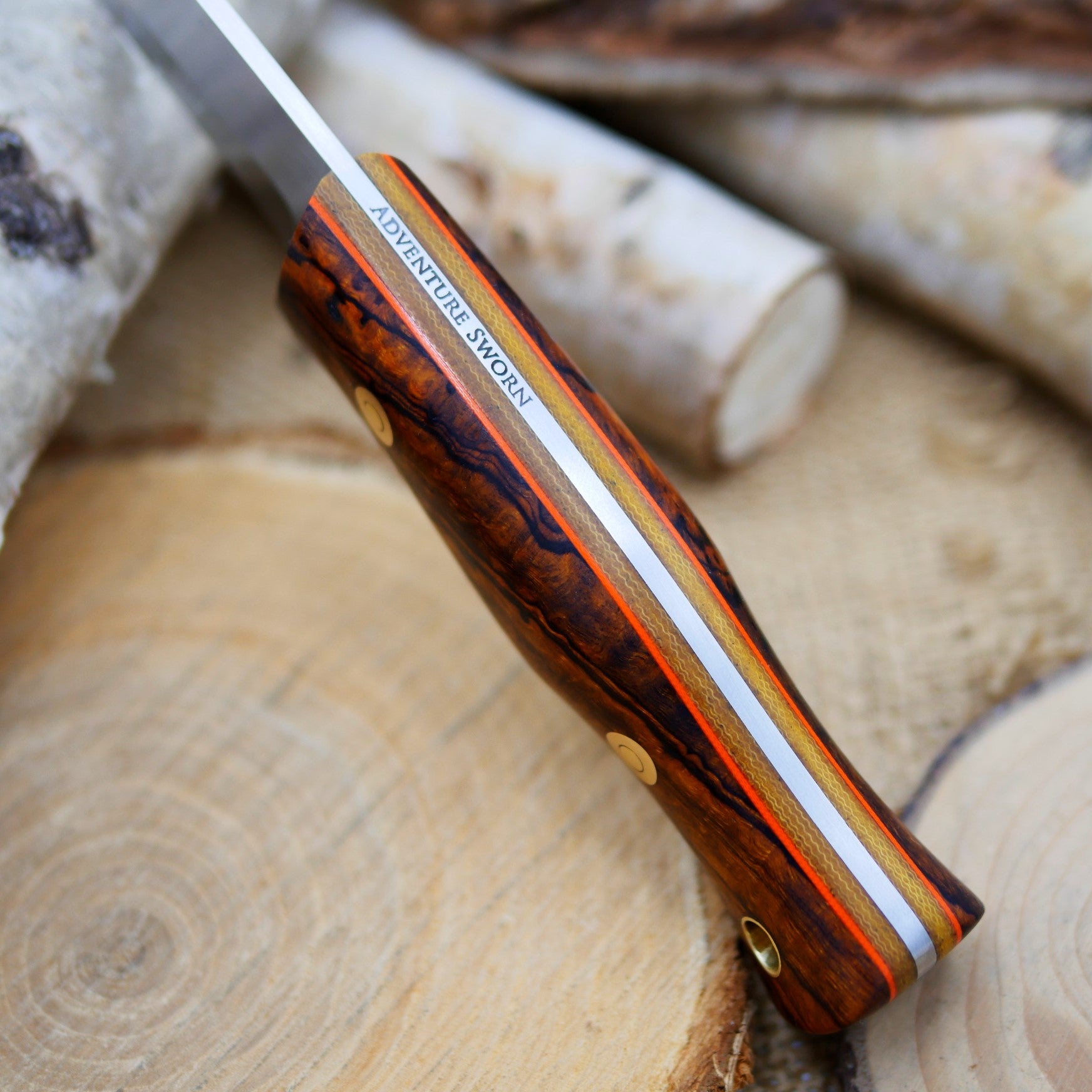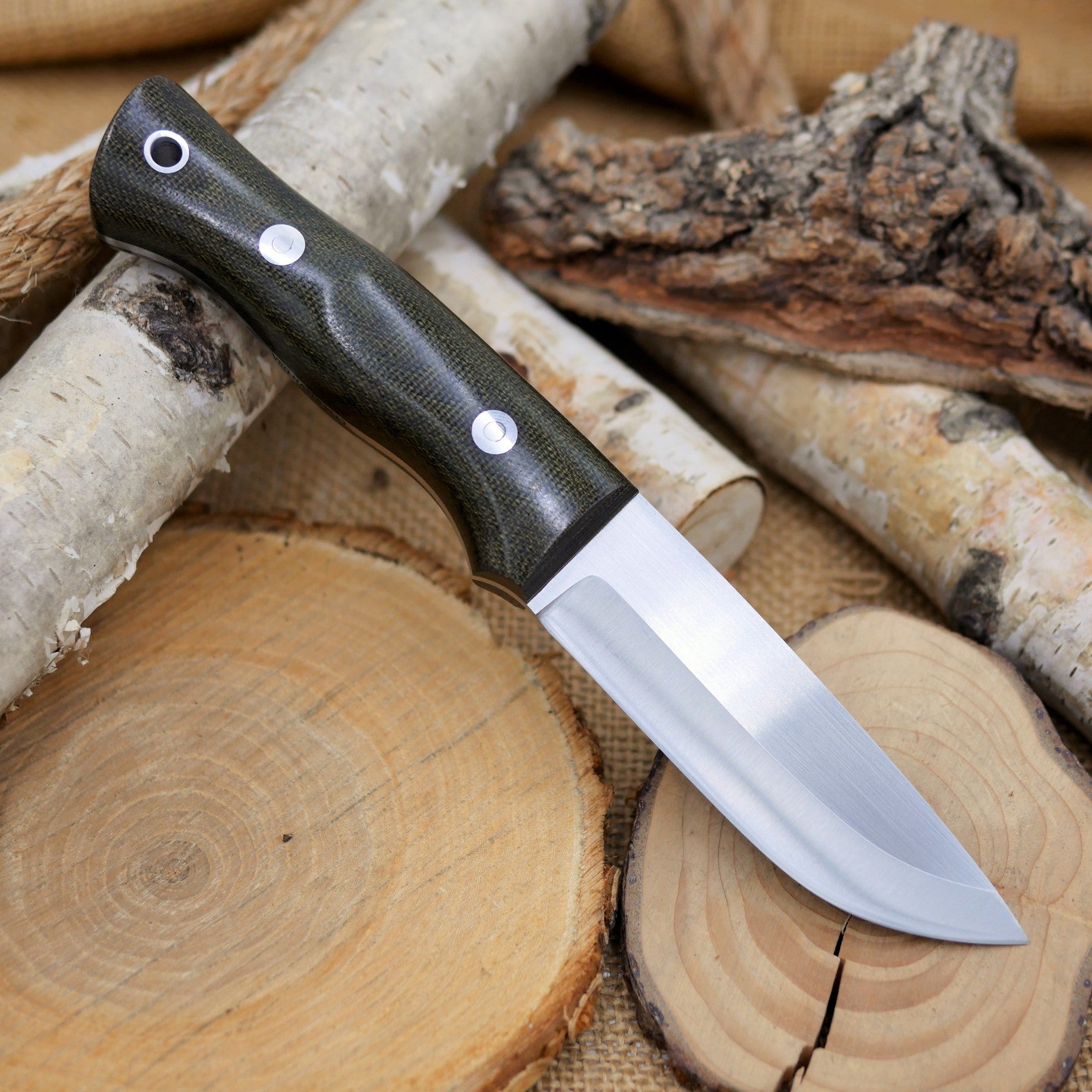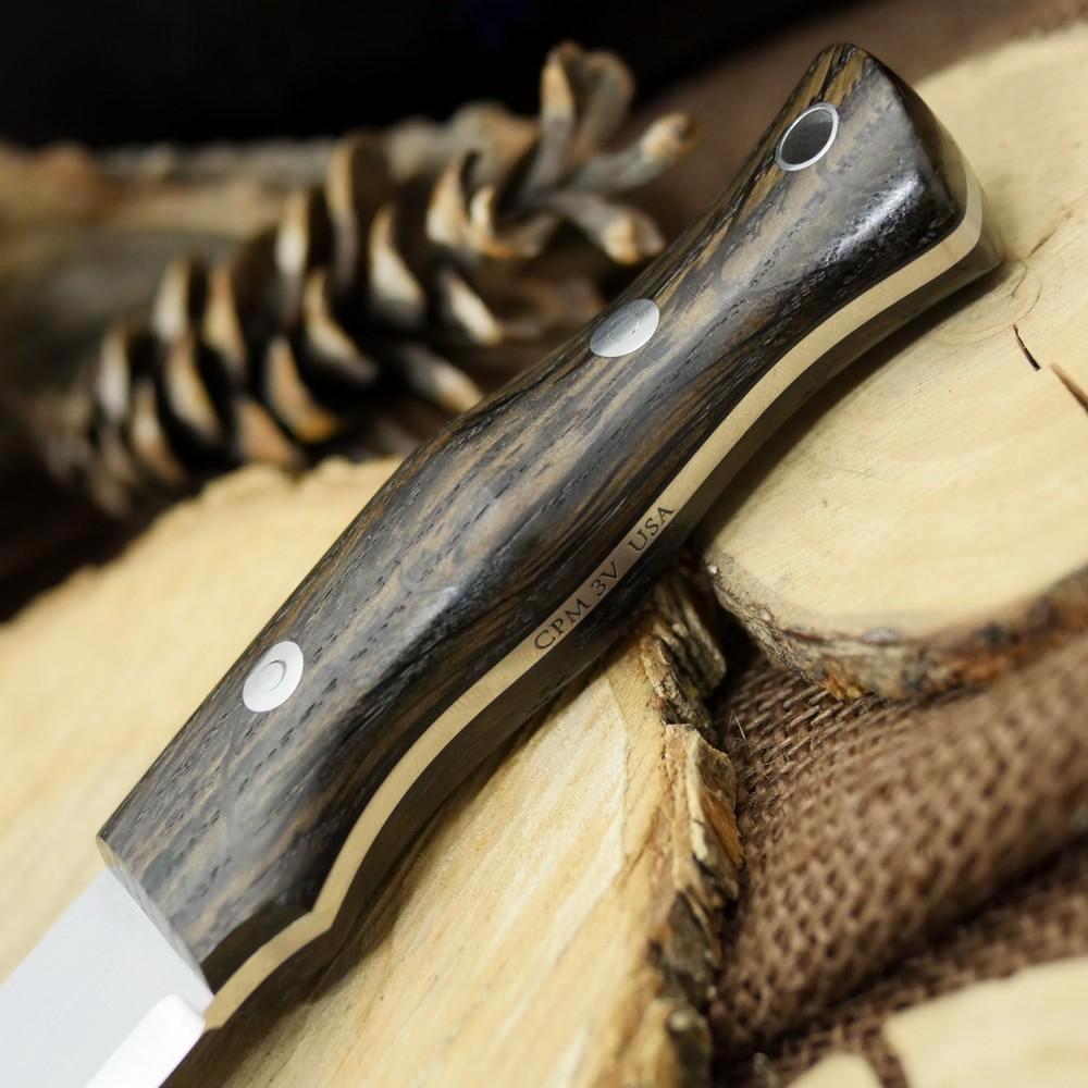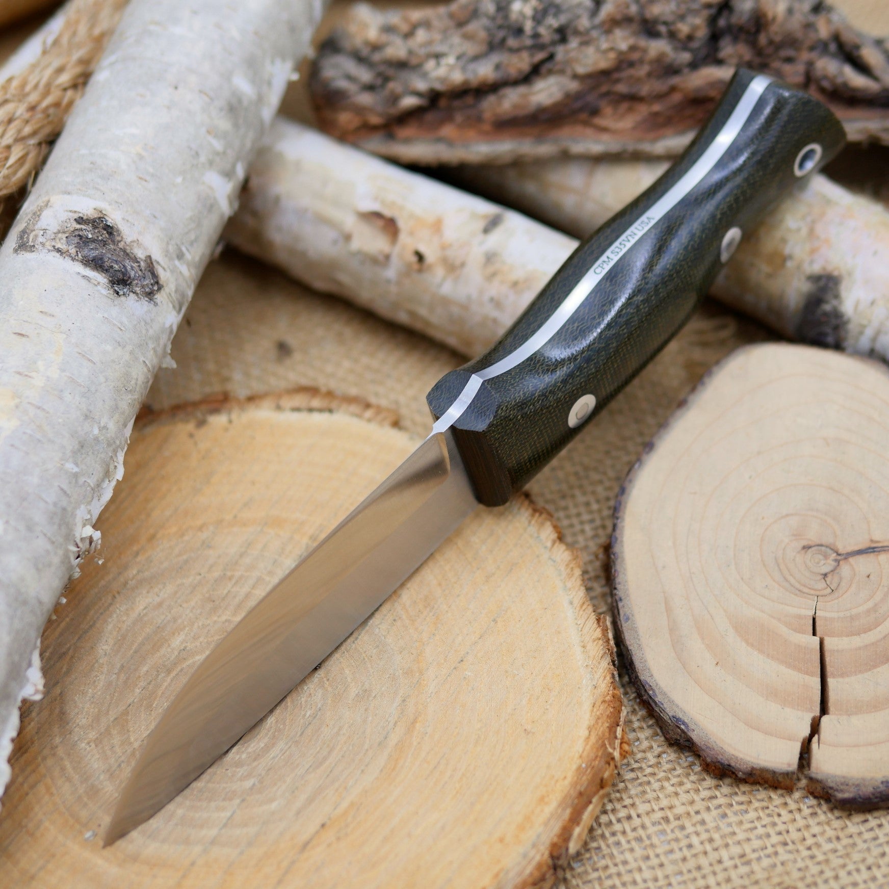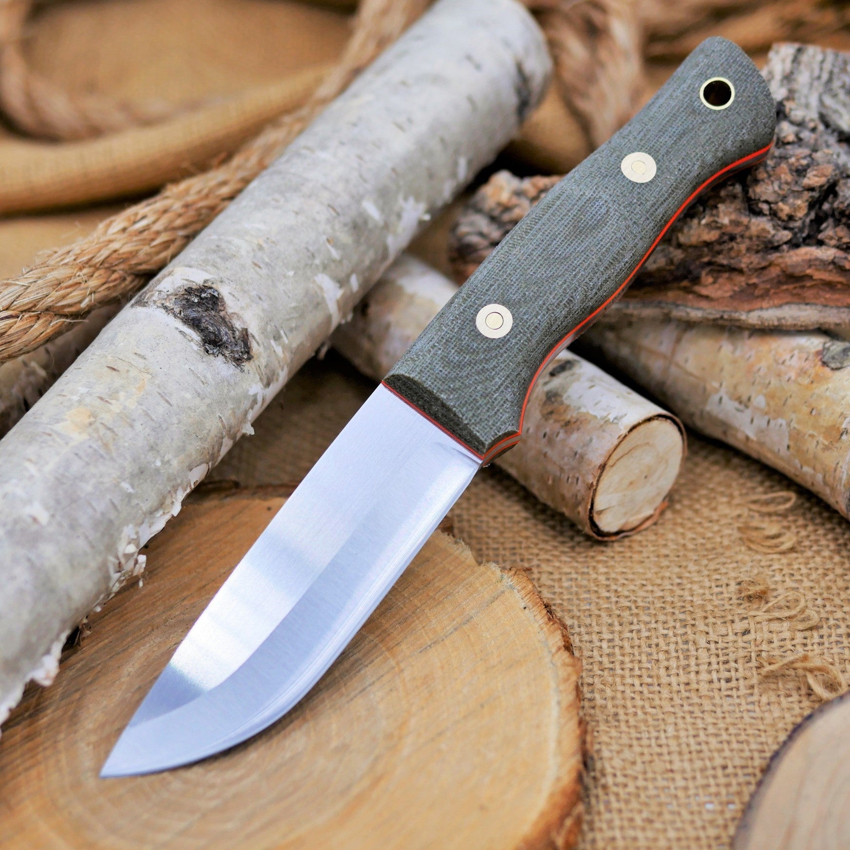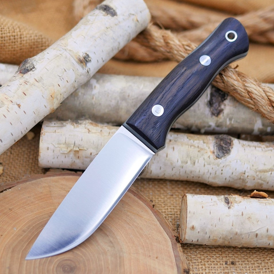 The Huntsman is a bushcraft-hunting knife hybrid which excels at processing wood and game alike.  Its dimensions make it excellent for skinning, gutting, and slicing, as well as making tent stakes, whittling traps, or carving a canoe paddle.  The knife is built strong enough to handle anything from building a shelter to splitting logs for the fire, a true companion to the outdoorsman.  Crafted in the USA.