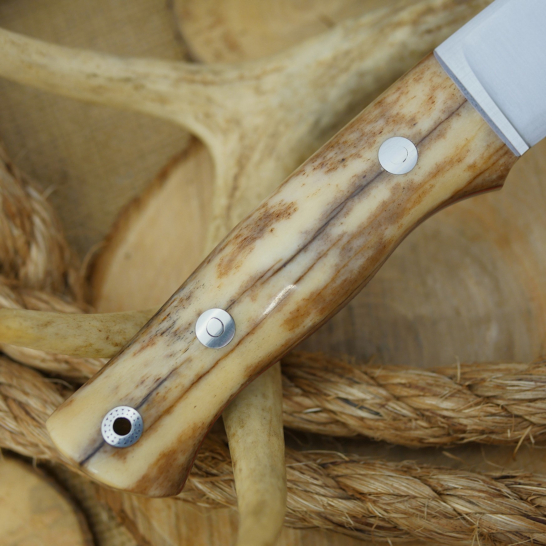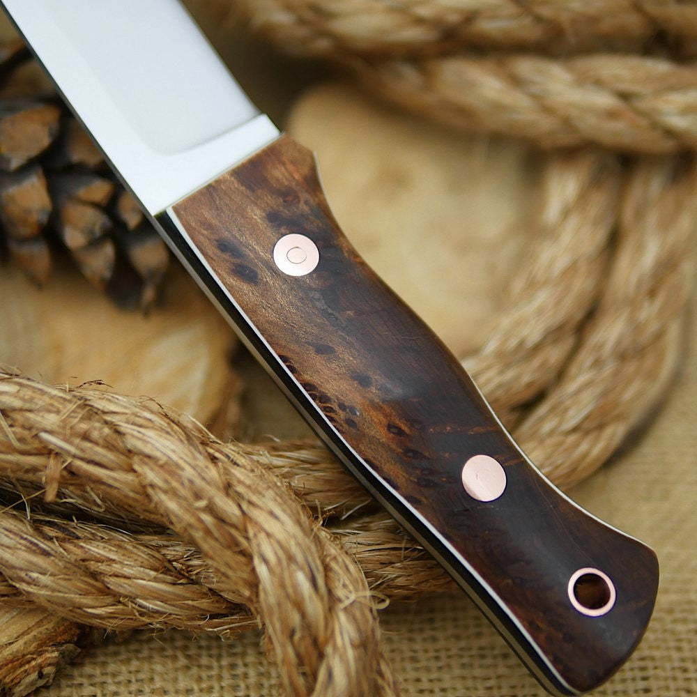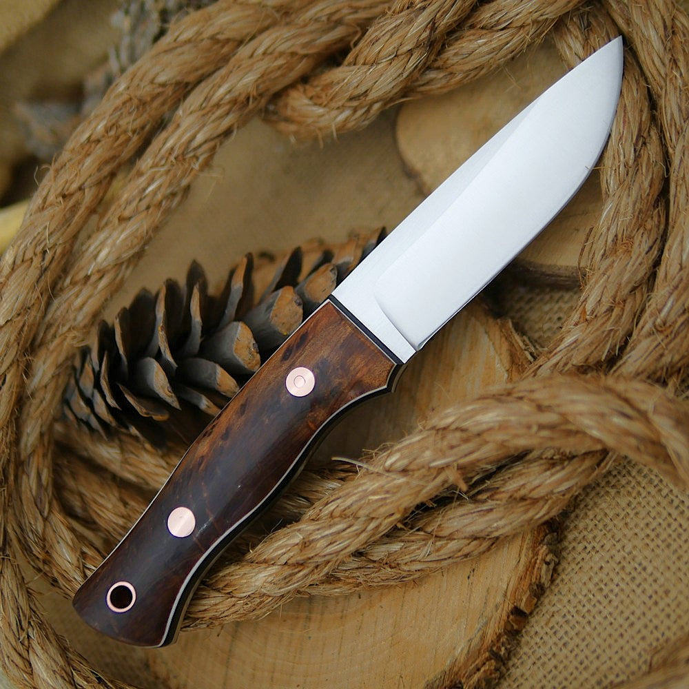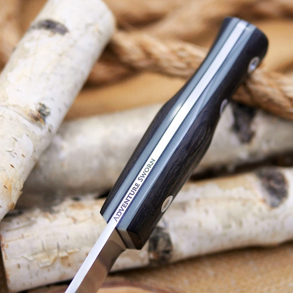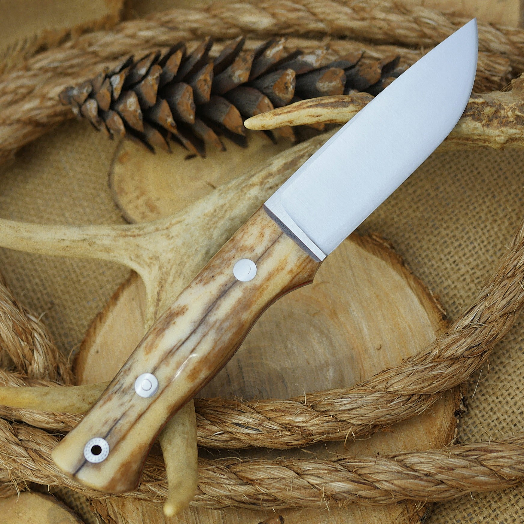The Huntsman is a bushcraft-hunting knife hybrid which excels at processing wood and game alike.  Its dimensions make it excellent for skinning, gutting, and slicing, as well as making tent stakes, whittling traps, or carving a canoe paddle.  The knife is built strong enough to handle anything from building a shelter to splitting logs for the fire, a true companion to the outdoorsman.  Crafted in the USA.