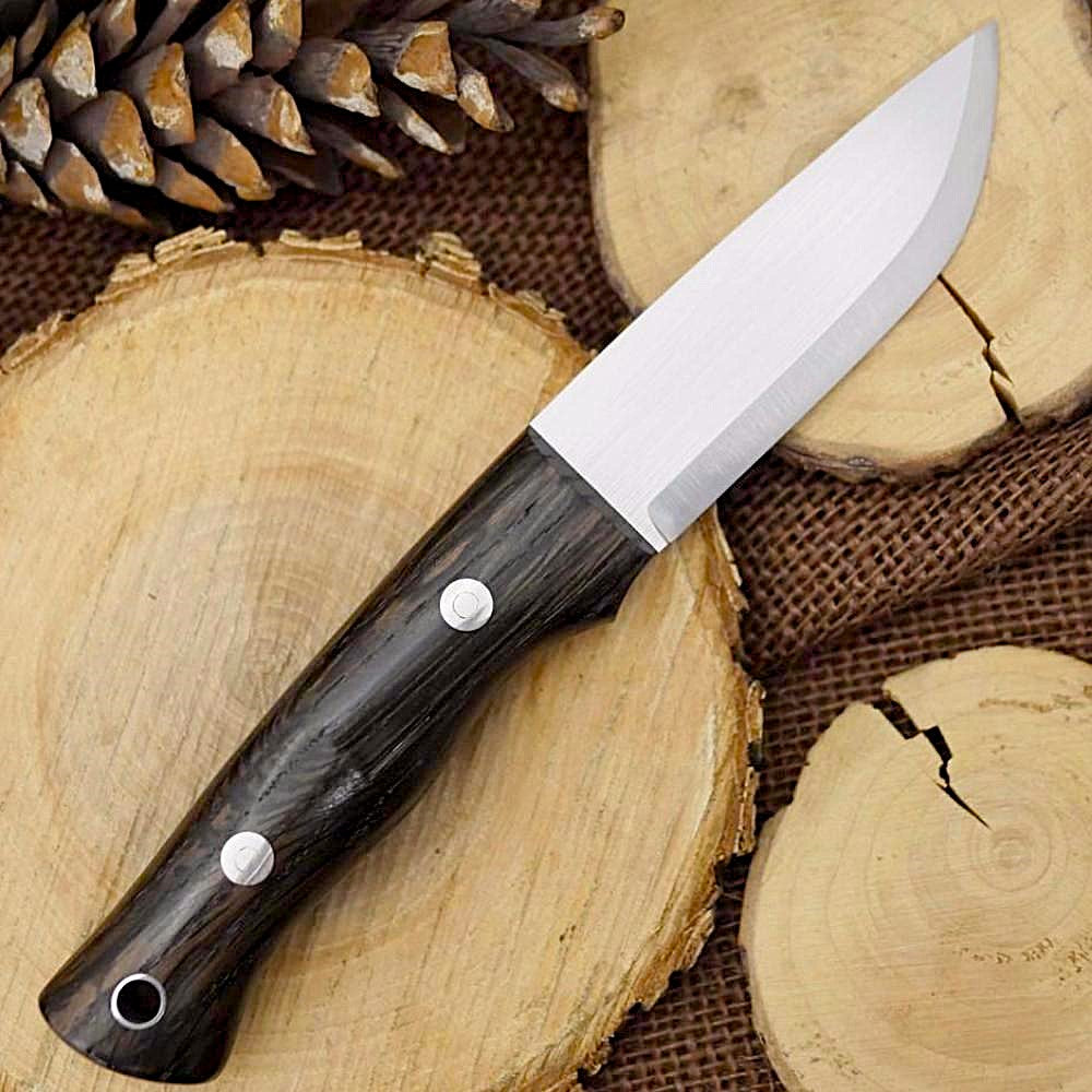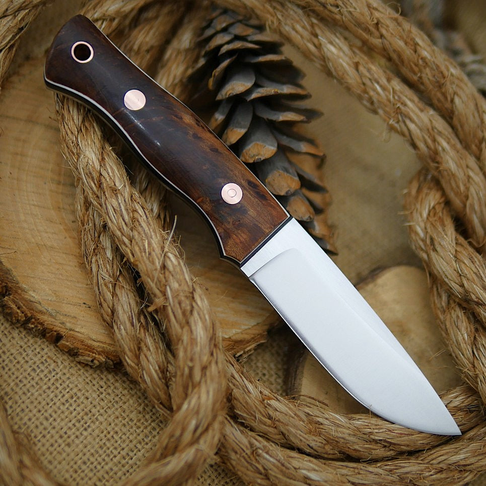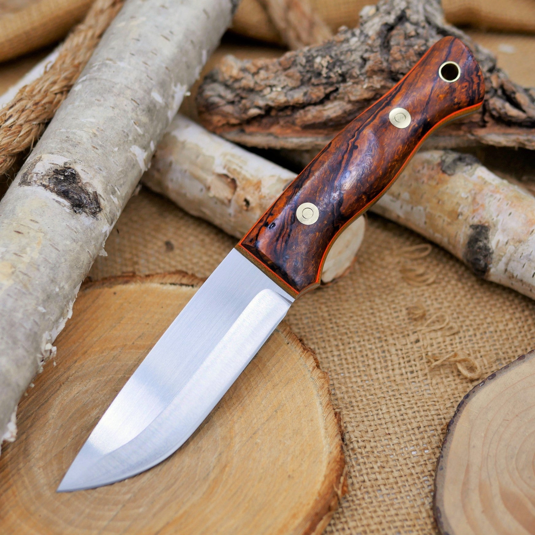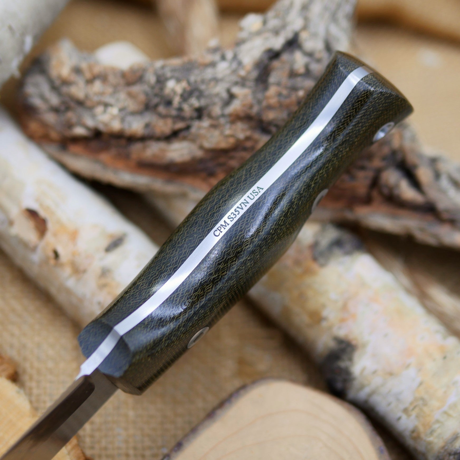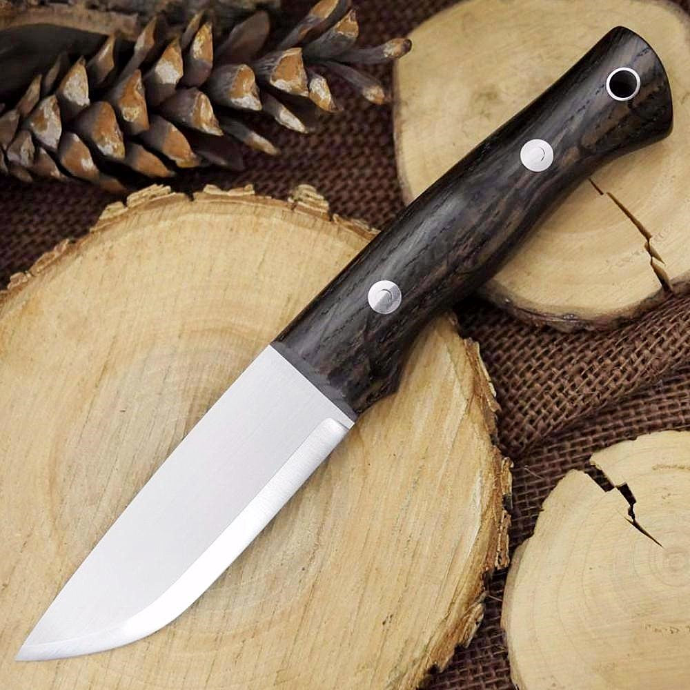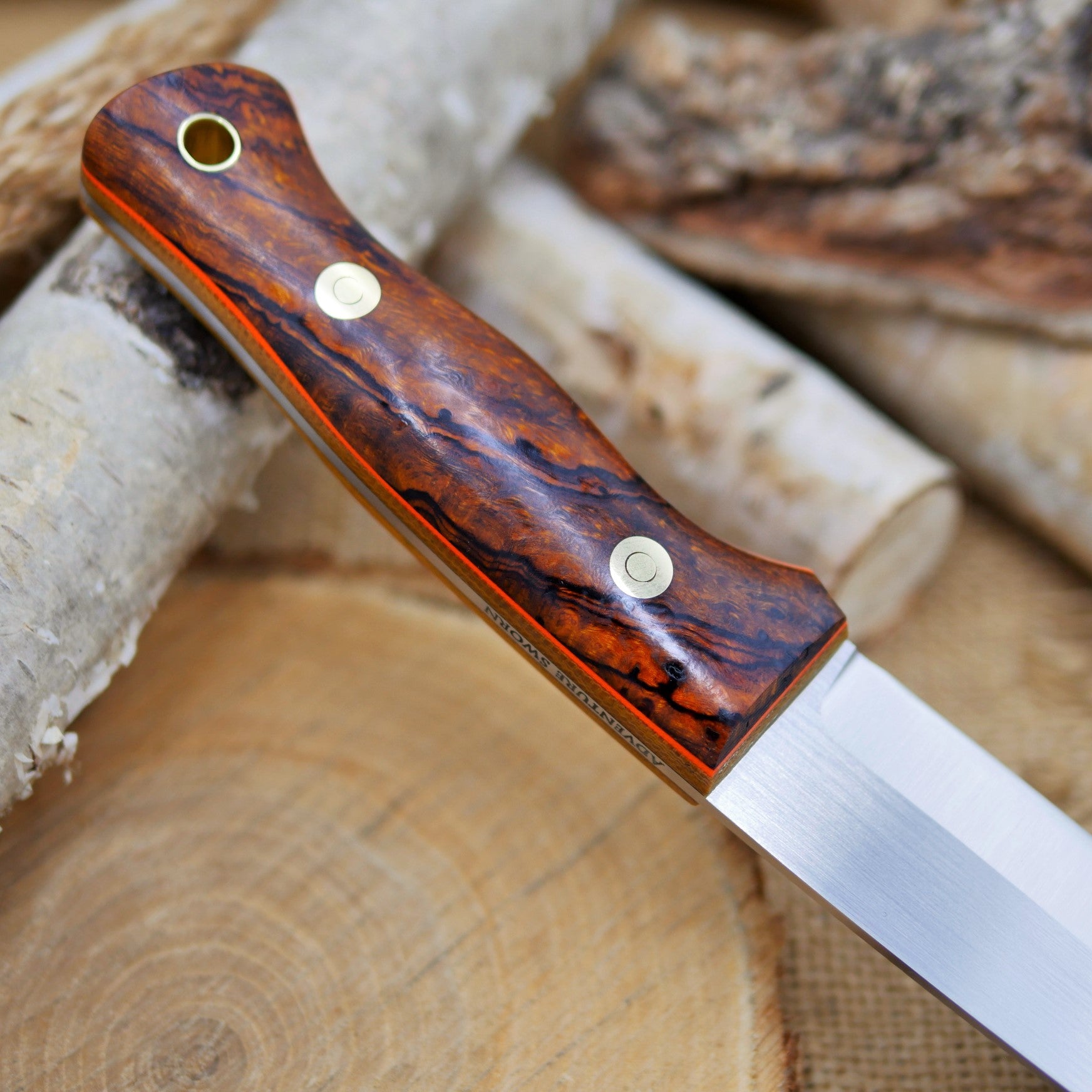 The Huntsman is a bushcraft-hunting knife hybrid which excels at processing wood and game alike.  Its dimensions make it excellent for skinning, gutting, and slicing, as well as making tent stakes, whittling traps, or carving a canoe paddle.  The knife is built strong enough to handle anything from building a shelter to splitting logs for the fire, a true companion to the outdoorsman.  Crafted in the USA.