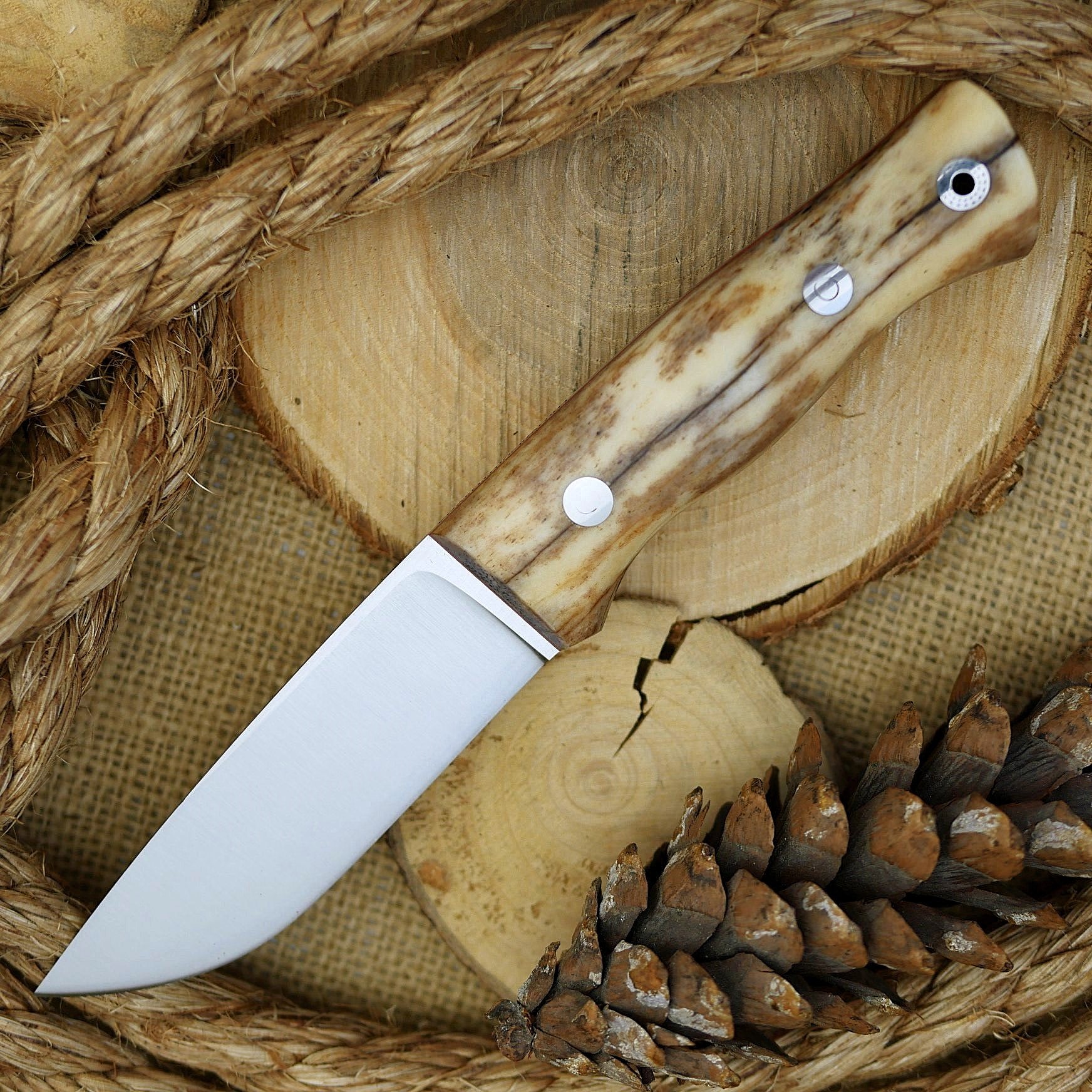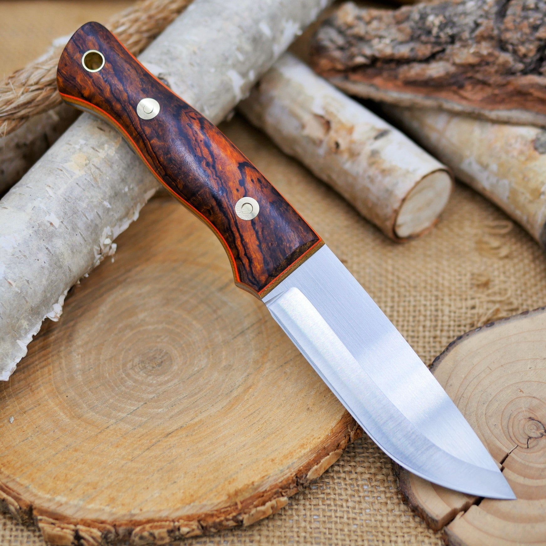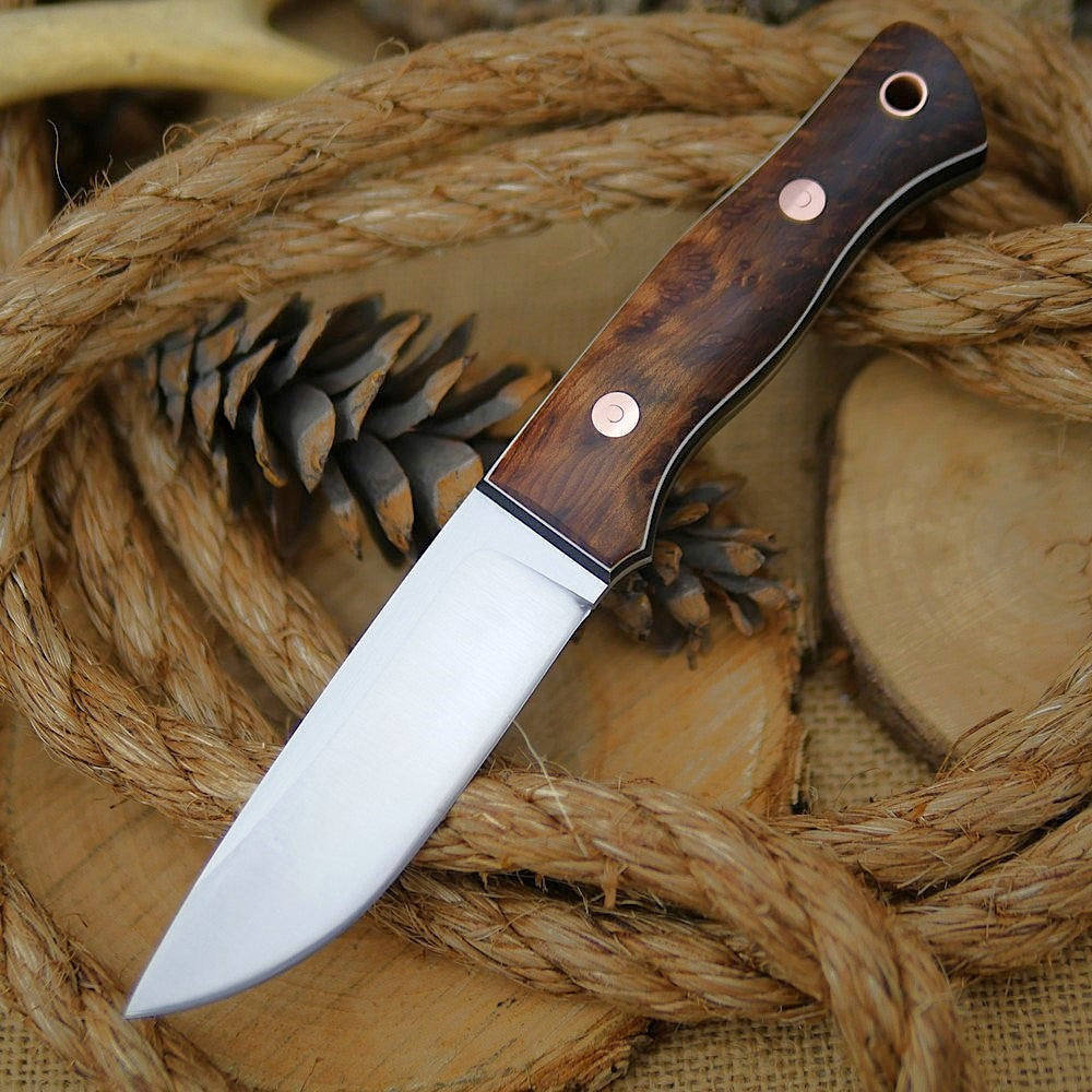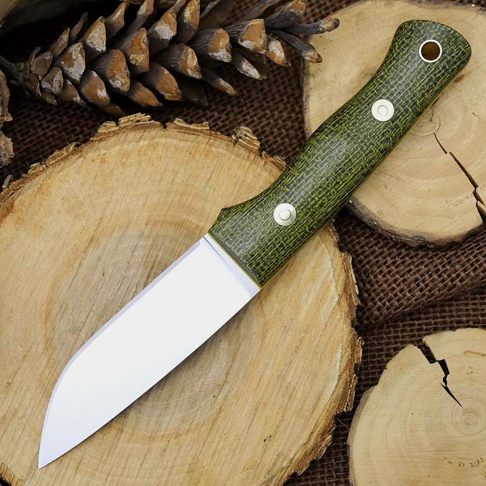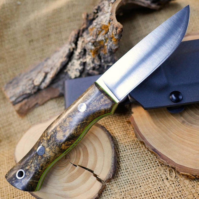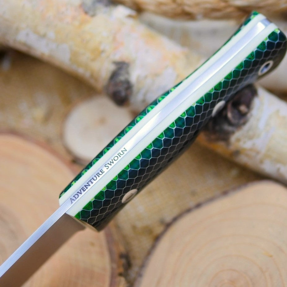 The Huntsman is a bushcraft-hunting knife hybrid which excels at processing wood and game alike.  Its dimensions make it excellent for skinning, gutting, and slicing, as well as making tent stakes, whittling traps, or carving a canoe paddle.  The knife is built strong enough to handle anything from building a shelter to splitting logs for the fire, a true companion to the outdoorsman.  Crafted in the USA.