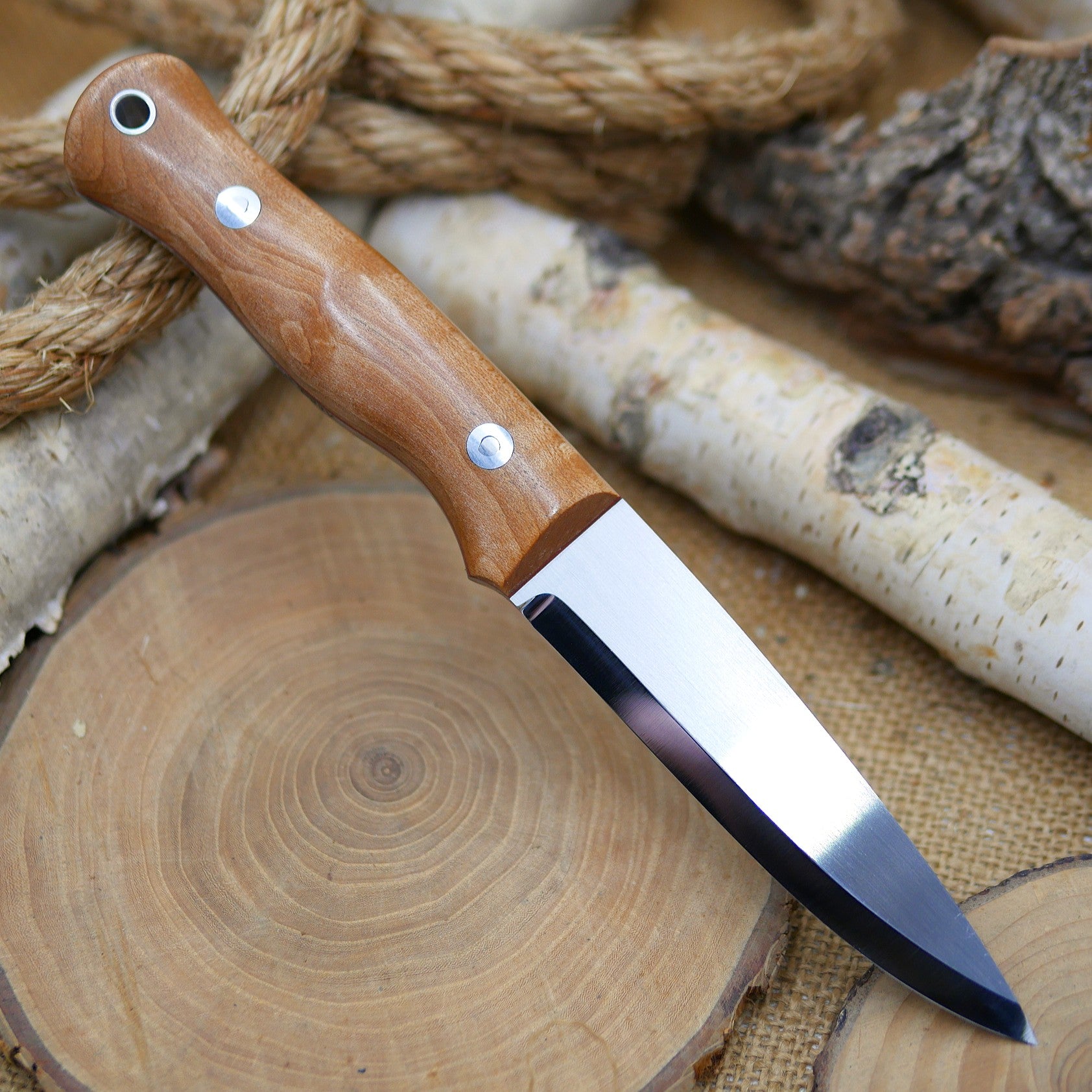 The Mountaineer is a versatile general-use bushcraft knife. The blade is long enough for batonning through wood logs and slicing food, but is also short enough for controlled woodworking. The drop-spear-point blade paired with the ergonomic coke bottle contoured handle make this knife excellent for use in the wilderness.