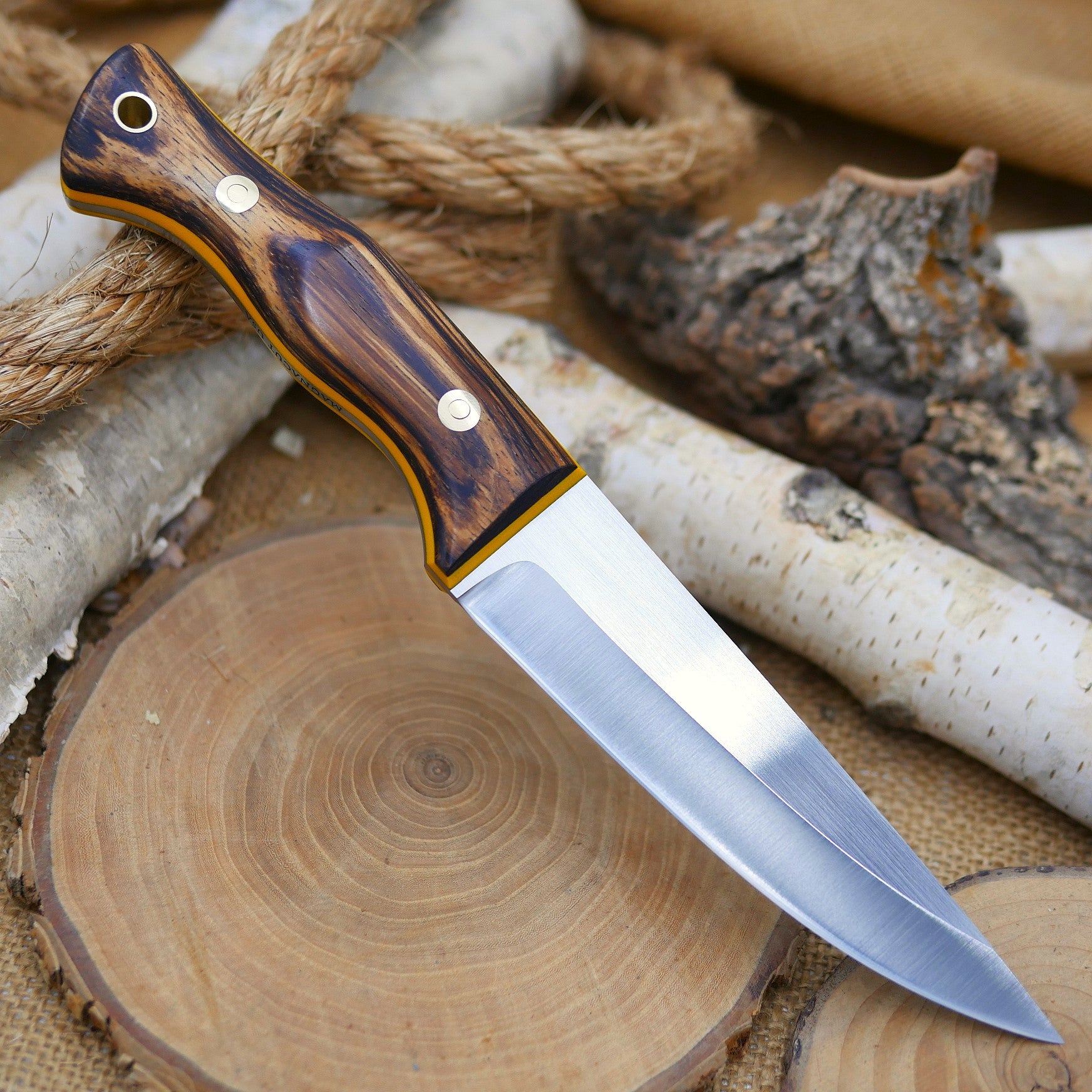 The Tradesman is a bushcraft knife inspired by the fur-trade knives brought to North America by it's early explorers. This knife has a relatively thin and constantly upward-curving edge, making it an excellent slicer. This is essentially a camp kitchen knife and bushcraft knife hybrid, excelling at preparing a stew or building a shelter.